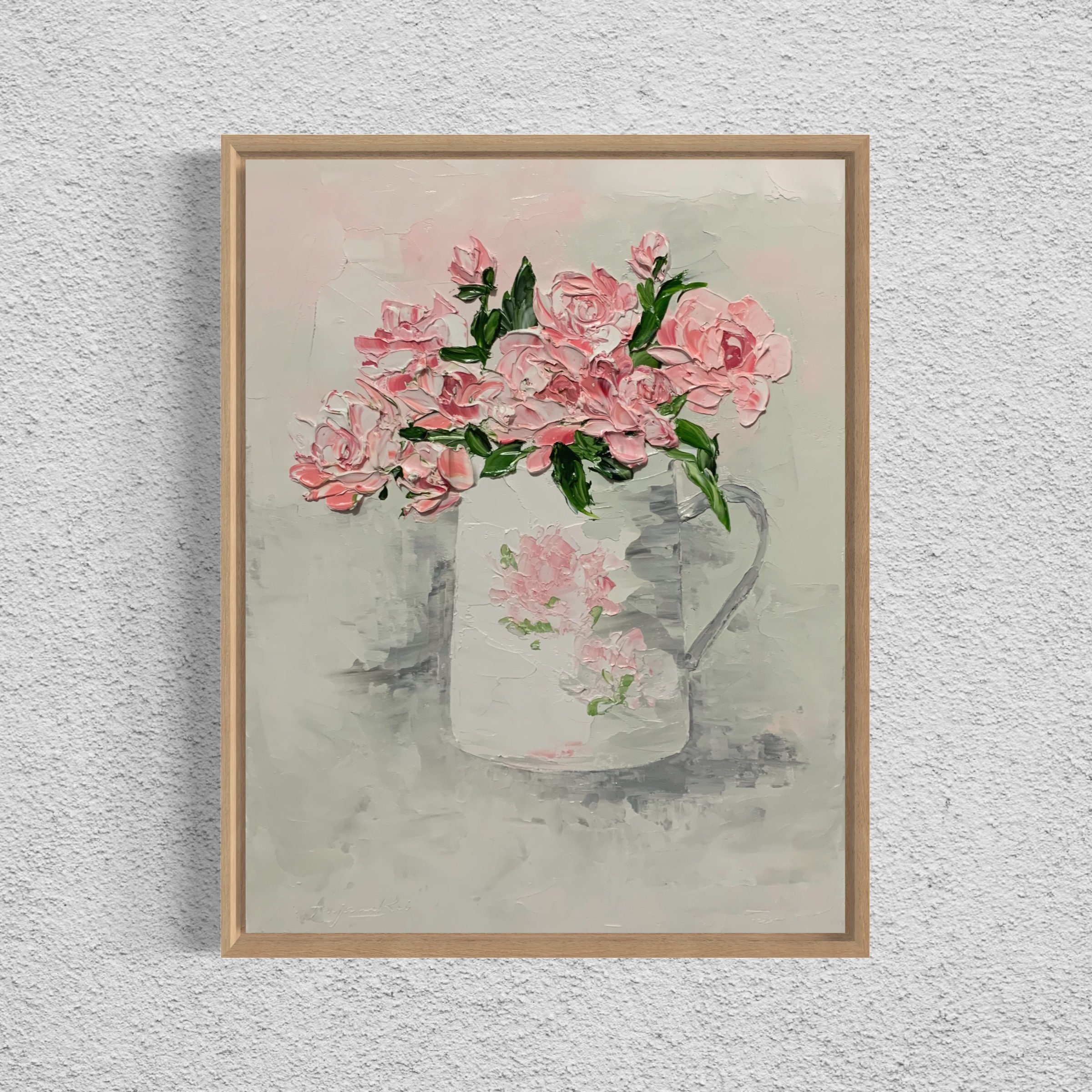 This artwork is painted using impasto technique with palette knife and is framed in oak floater frame, ready to hang.