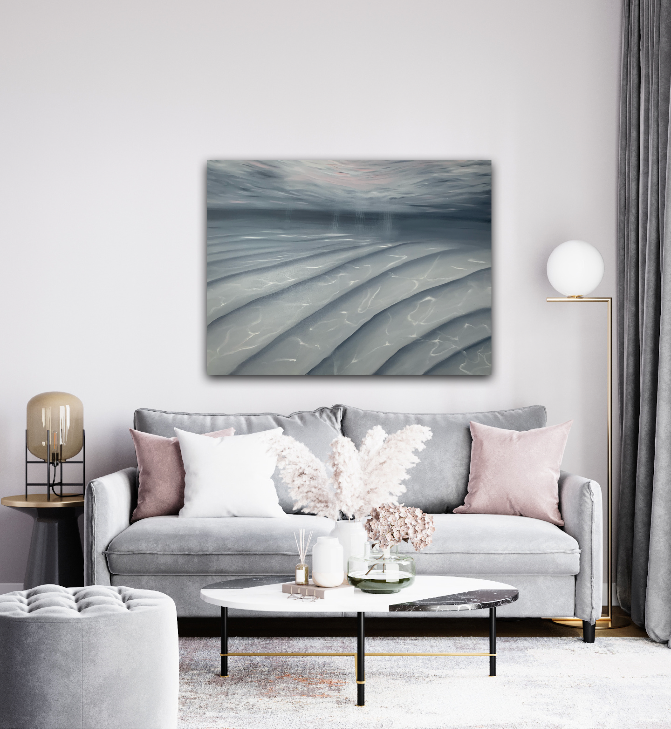 Salty Escape– by Alanah Jarvis – these modern almost monochromatic tones allow this piece to be a subtle statement in most rooms. It allows the viewer to look out into the distance and has potential to push a wall away in a room creating an illusion of more space. The light dancing on the surface and the bottom of the sand allows you to be at peace in another world which resonates with every underwater kick of your swim.