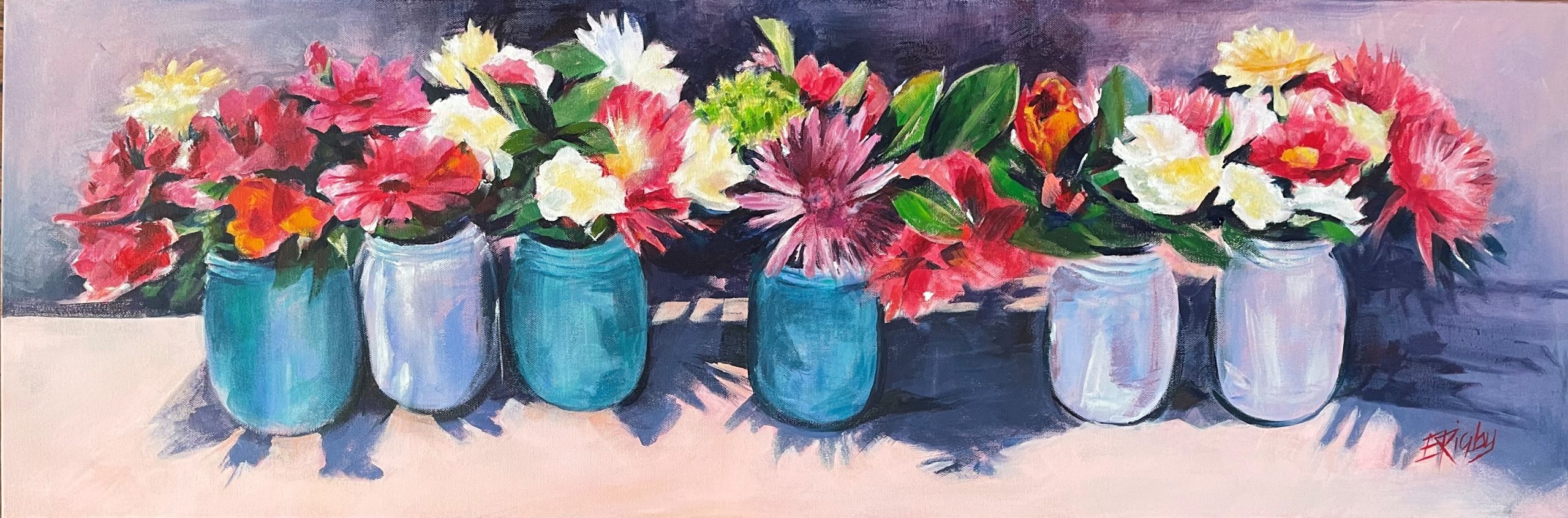 I wanted to create a long still-life and so I decided to use six turquoise and lilac coloured jars in contrast to the pinks,reds and whites of the floral arrangements. I liked the shelf like arrangement and could visualize the finished painting against a choice of background colours. I aimed for a feeling of freedom in the brush techniques. I always use professional Atelier paints.