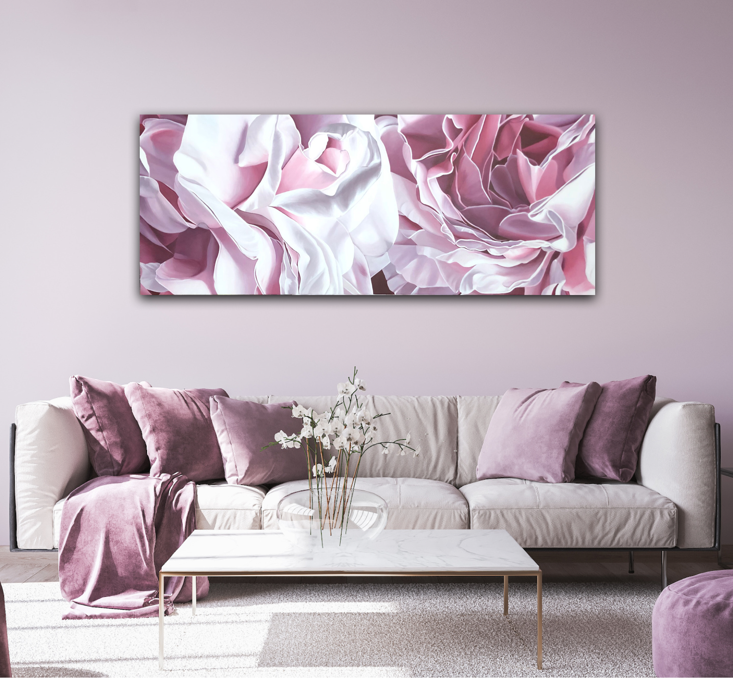 Painted on a large canvas which could be hung in either landscape or portrait style to suit the room and has been wired for both (I have included pics as examples). Deep Pink White Roses Large.