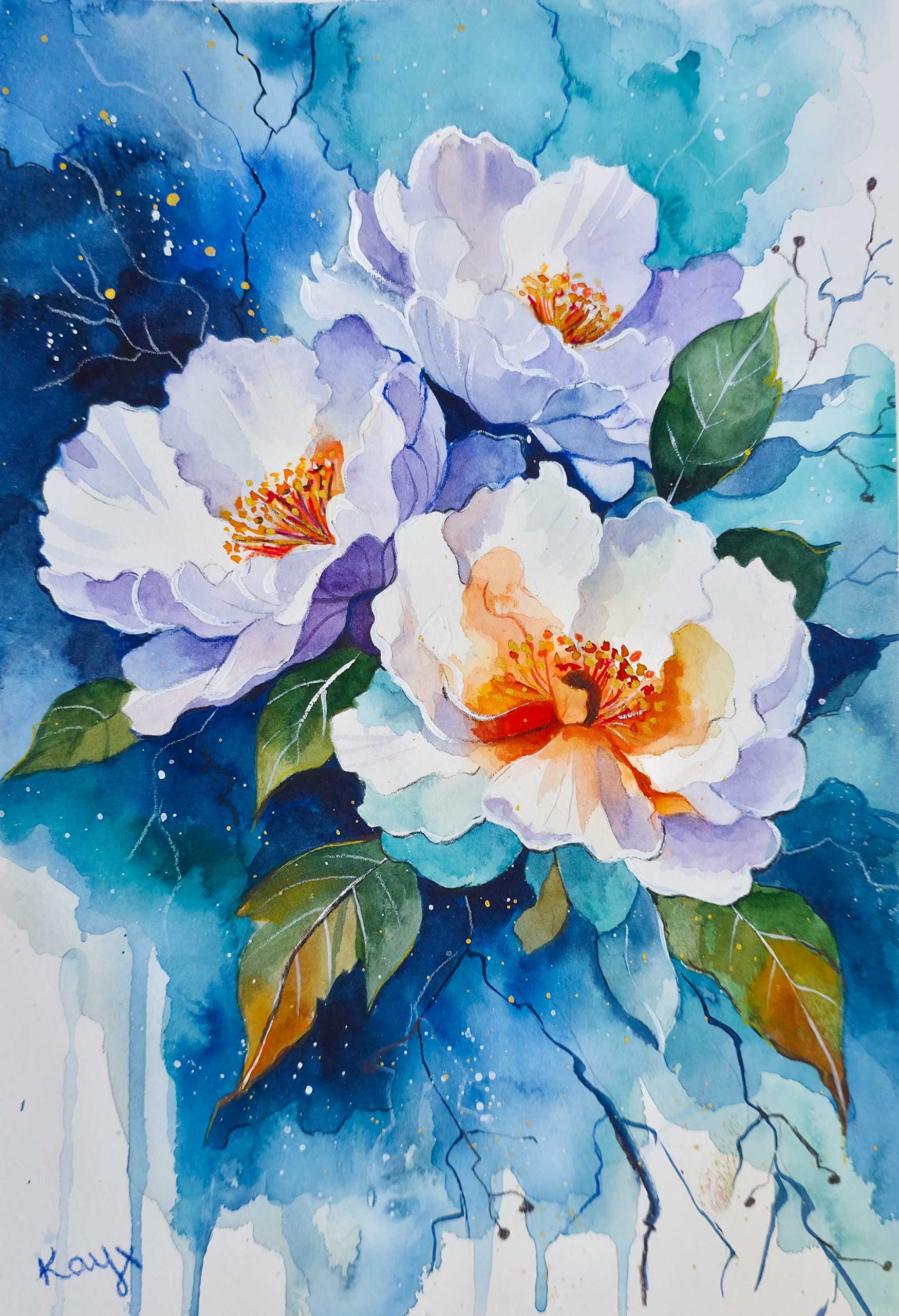 A Softness in Bloom by Kay Shanley is a watercolour exploration of gentleness and light. White peonies float against a cool blue background, their petals open and airy, warmed by vibrant orange centres that bring a subtle glow to the composition.