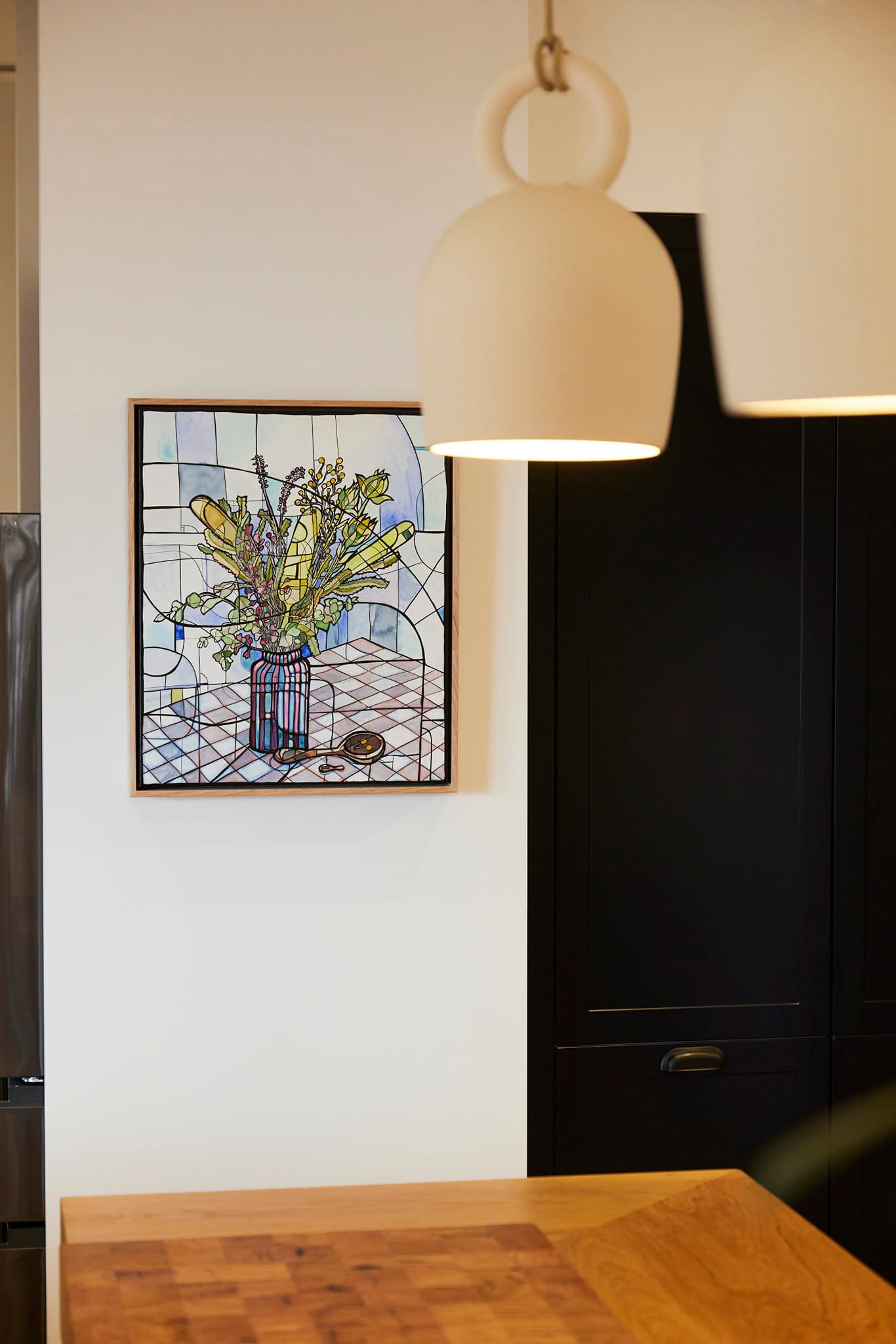 A still life of a banksia filled vase on a checked table cloth with two wooden spoons, one of which holds fallen wattle flowers. The hand-carved spoons add to the sweetness of the painting which is made up of pinks and blue watercolour washes which contrast with the cool yellows and greens of the bouquet. Simplified and flattened perspectives and organic lines add to the playfulness of the image.
