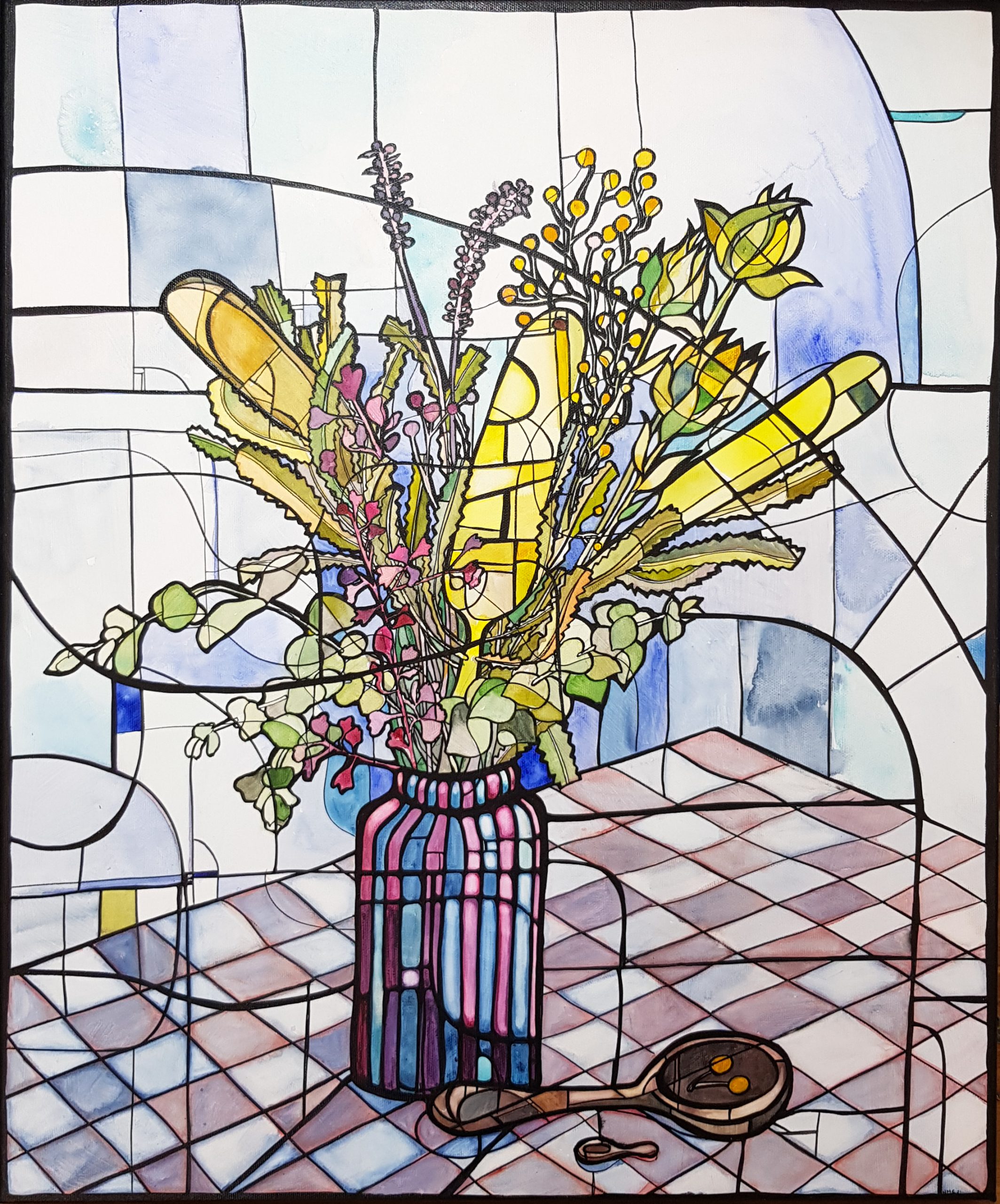 Exaggerated perspectives and organic lines add to the playfulness of the image. The spring colours in the banksias contrast with the blues, pinks and purples throughout the rest of the painting.