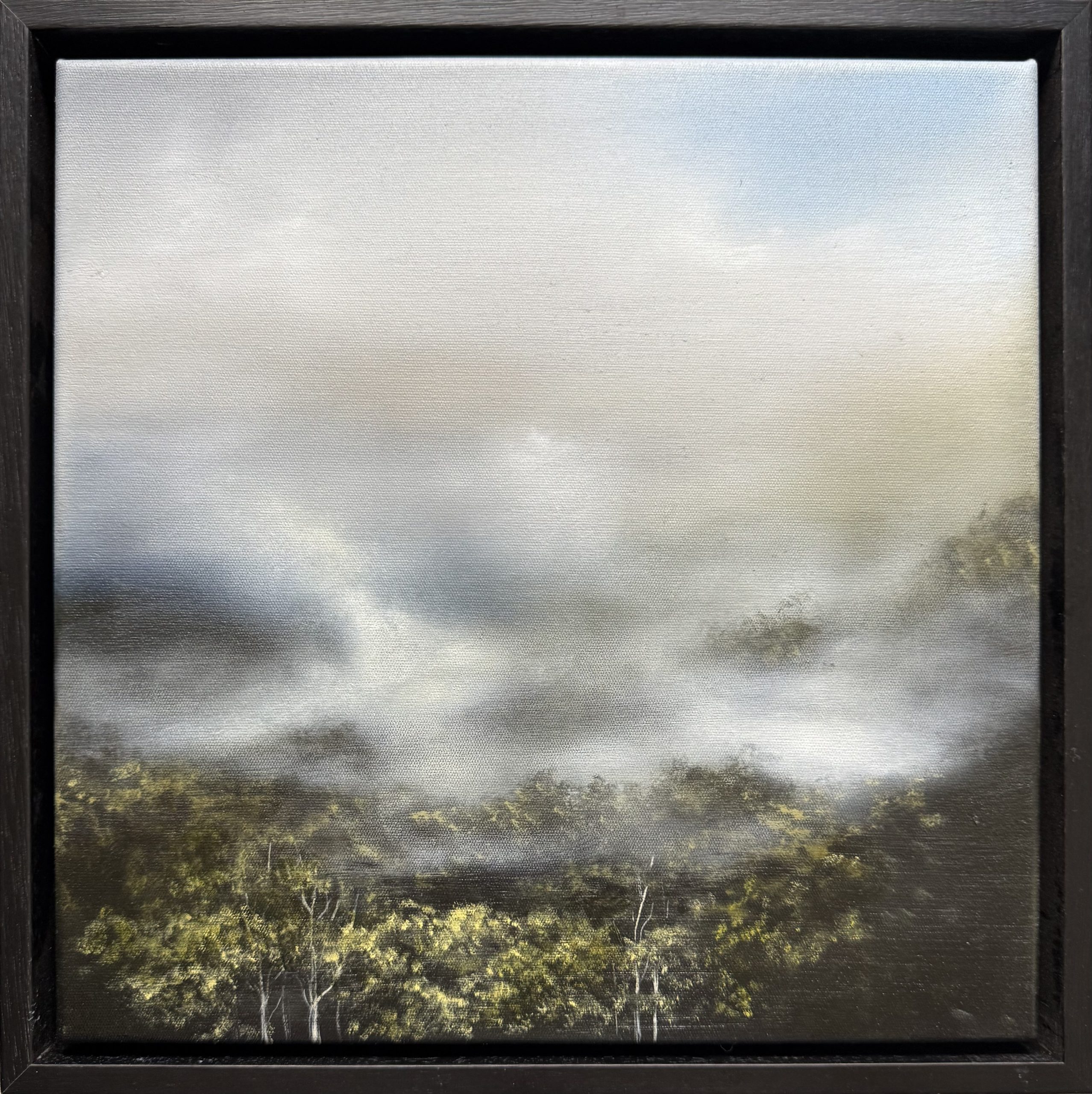 Ready to hang, original oil painting on stretched canvas with black oak floating frame.