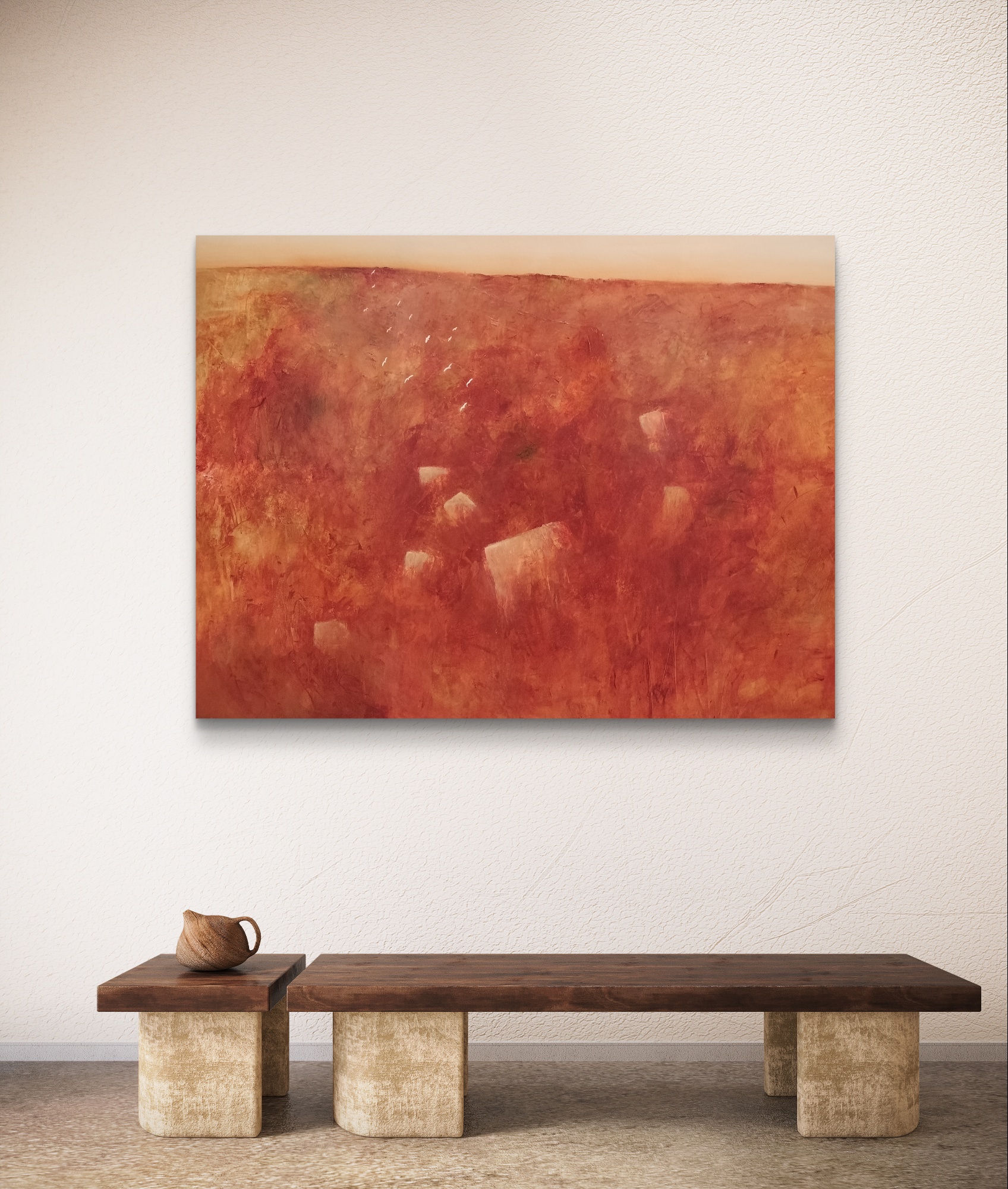 ‘A Sunburnt Country’ is a landscape painting that captures the harsh yet striking beauty of an arid, sun-drenched land. The artwork portrays vast stretches of dry earth, rugged terrain, and a glowing, dusky sky, reflecting the unforgiving heat of the environment. The scene evokes feelings of isolation and resilience, with a color palette dominated by warm tones of ochre, burnt orange, and deep reds, symbolizing the searing sun and parched soil.