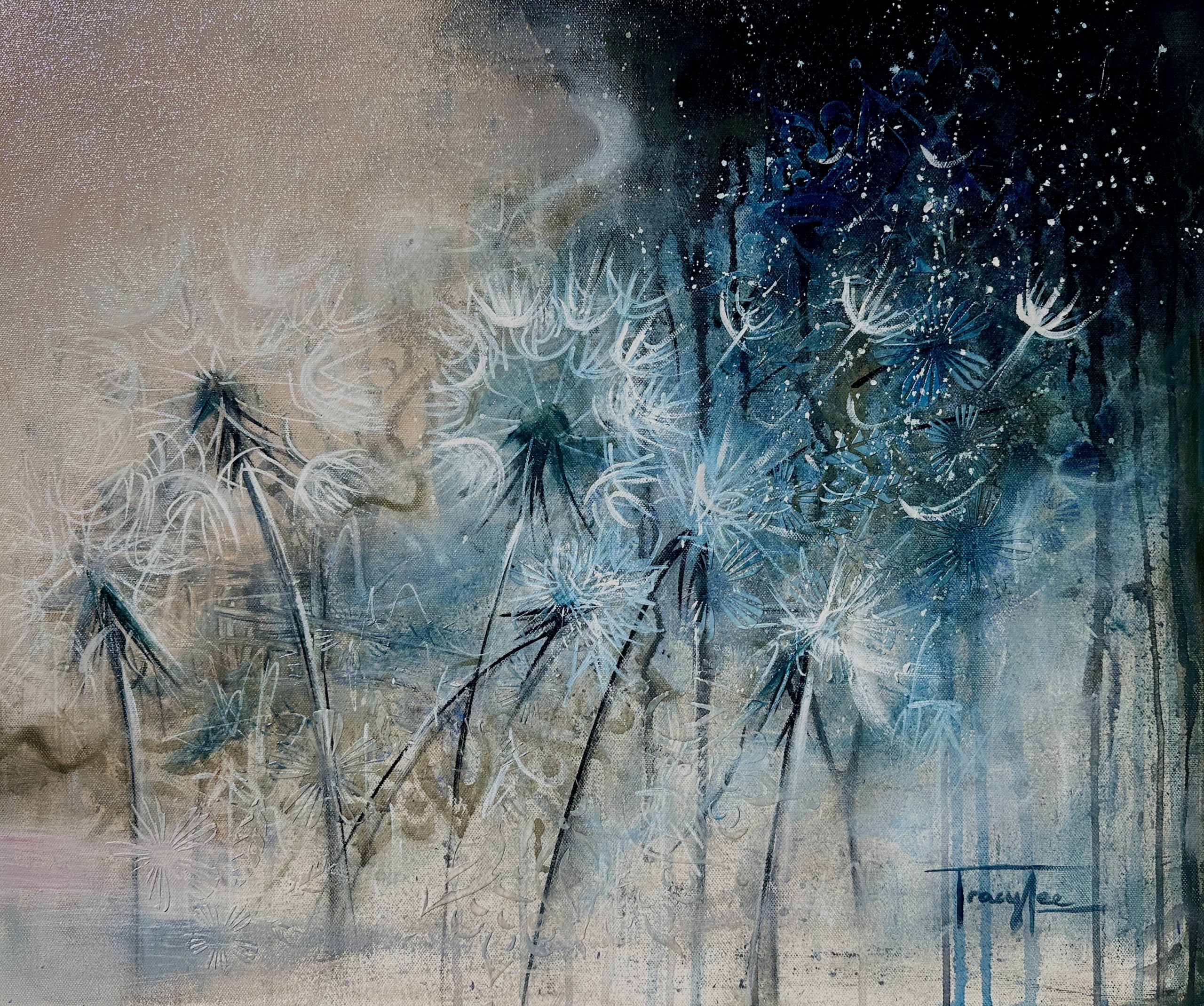 Visually, A Thousand Tiny Journeys brings release and wonder —blues and pinks blending into the darkness of the nebula offer calm, while vibrant details of dandelions and stars spark curiosity and conversation. Layers of charcoal, inks, spray paint, modelling paste, acrylics, and rich oils create a textured surface full of depth and complexity. The edges are painted on quality gallery wrapped canvas, the surface varnished, and it is ready to hang.