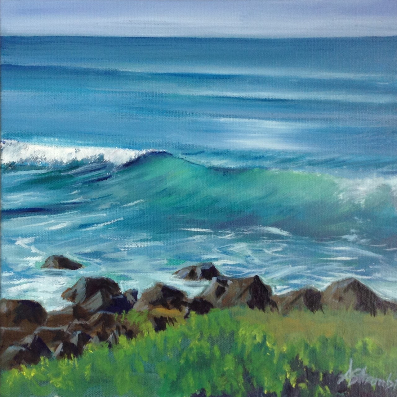 A Wave – This original oil painting captures a glimpse of a wave starting to break next to a rocky coastline, with the light making the water translucent as it curls over. This painting was inspired by the coastal view near Lennox Head, northern NSW. Varnished and ready to hang.