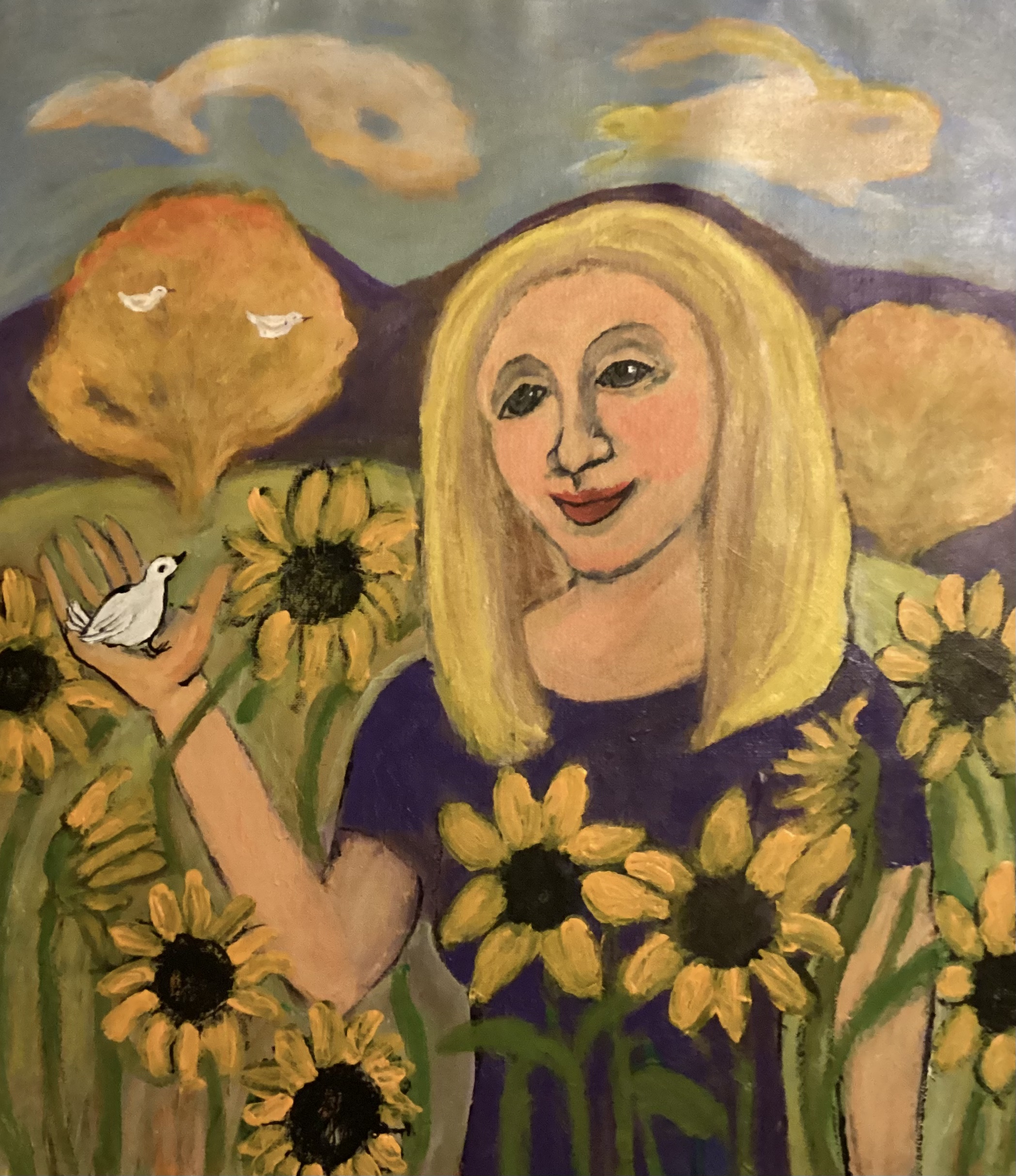 A way to Happiness by Margaret Connell is whimsical and colourful original painting. It is an interpretation of the Maxim A bird in the hand is worth more than two in a bush and adhering to this principle leads one to more satisfaction in life.