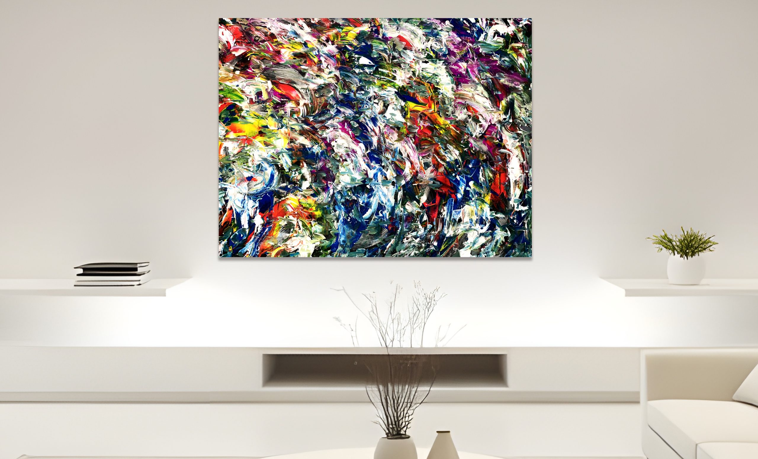 This artwork is painted on professional-grade canvas, stretched, and sealed with varnish. The canvas measures 140 cm in width by 107 cm in height. The painting is painted in the same manner as the surface on the sides, giving it a colour wrap.