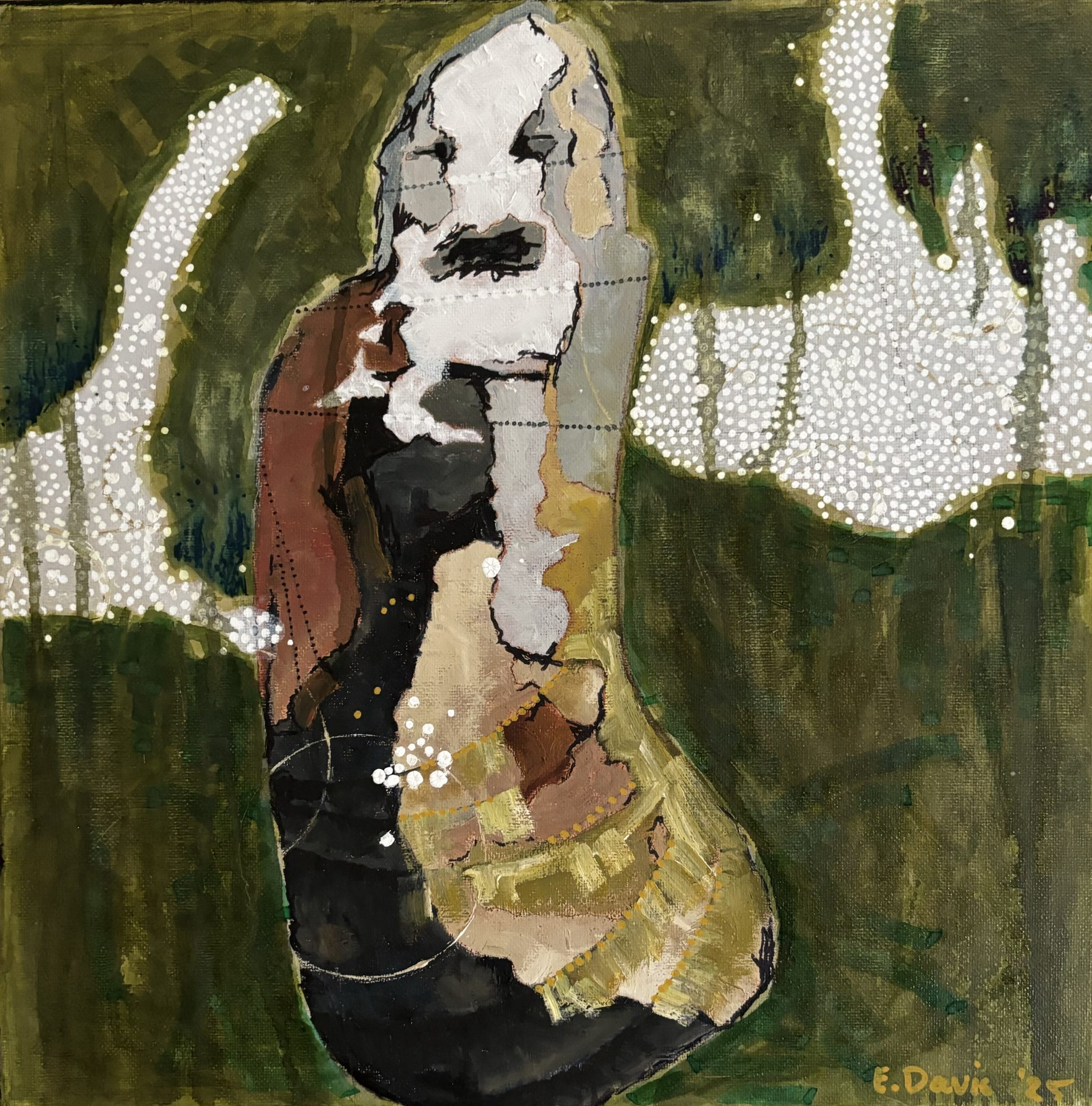 Abstract painting inspired by looking into a rock pool and finding a shell with a face on it.