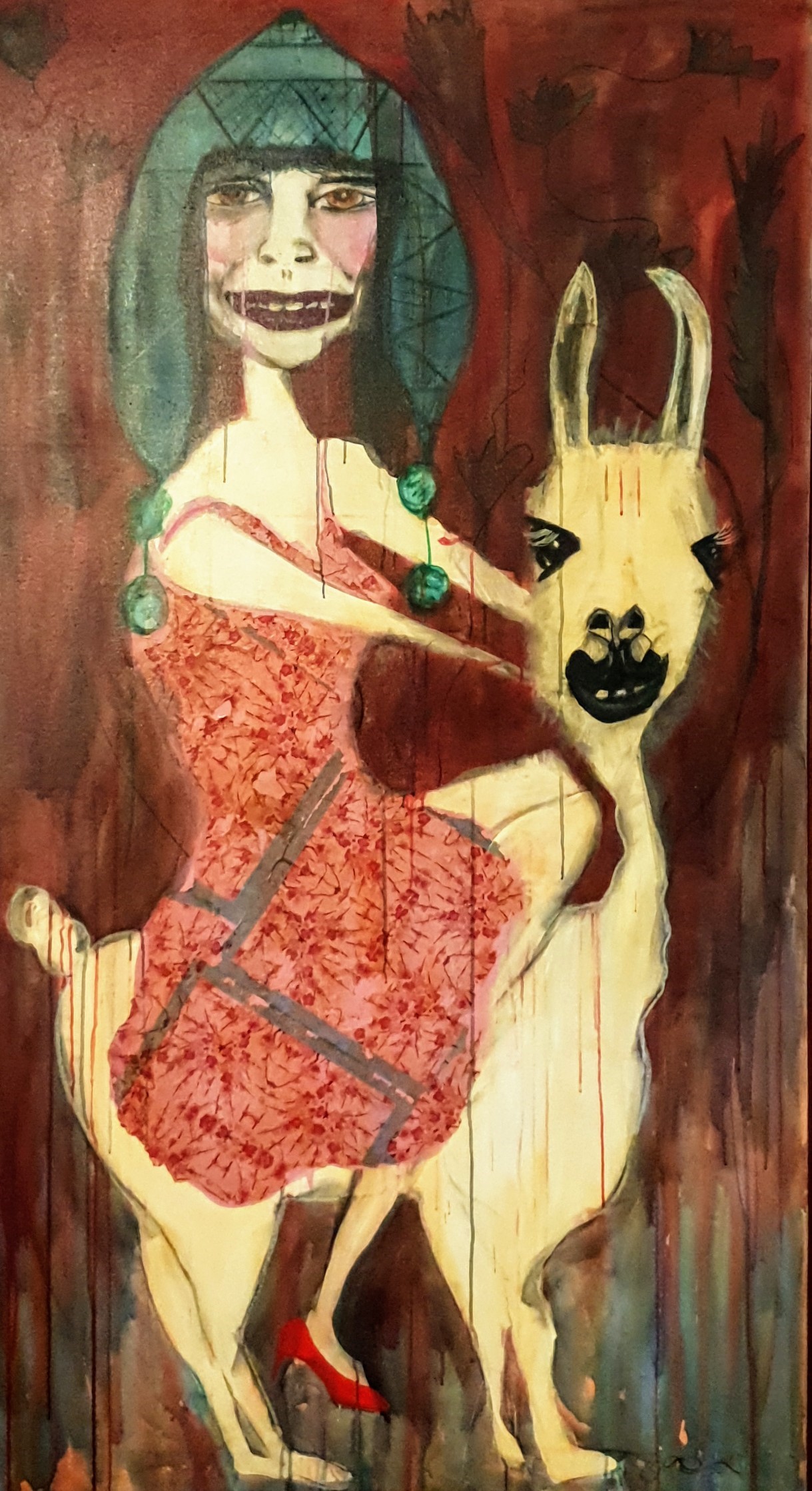 I chose to paint Abbie as I see her- growing up with her Peruvian and English heritage proudly blended into the Australian we see today. The Llama and parts of the Peruvian flag are evident in the painting as is the Traditional Peruvian hat (Chullo) she is wearing. I see Abbie as a beautiful confident young lady with enough inner light to outshine anything or anybody in the room, including a Llama.
