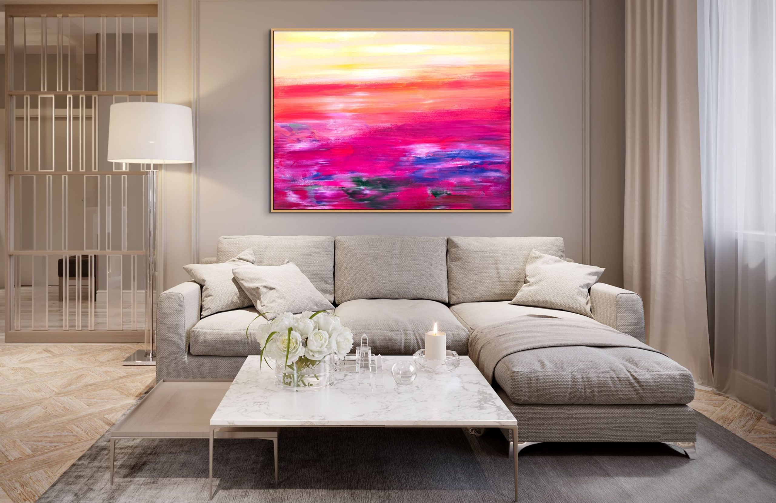 This artwork is painted on professional-grade canvas stretched and sealed with varnish. The canvas has dimensions 160 cm in width by 120 cm in height. The painting is painted on the sides in a different colour.