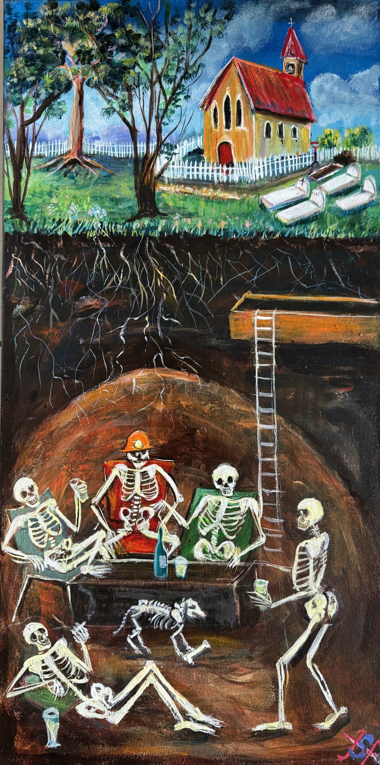 Above and Below by Sue Hill – A suggested subject for a painting was the title “above and below” which led Sue to paint this whimsical/humorous portrayal of a church graveyard and trees above ground and an enjoyable life under the ground. Under the ground Sue has painted skeletal beings, including that of a dog having a wonderful time with a bone below ground.