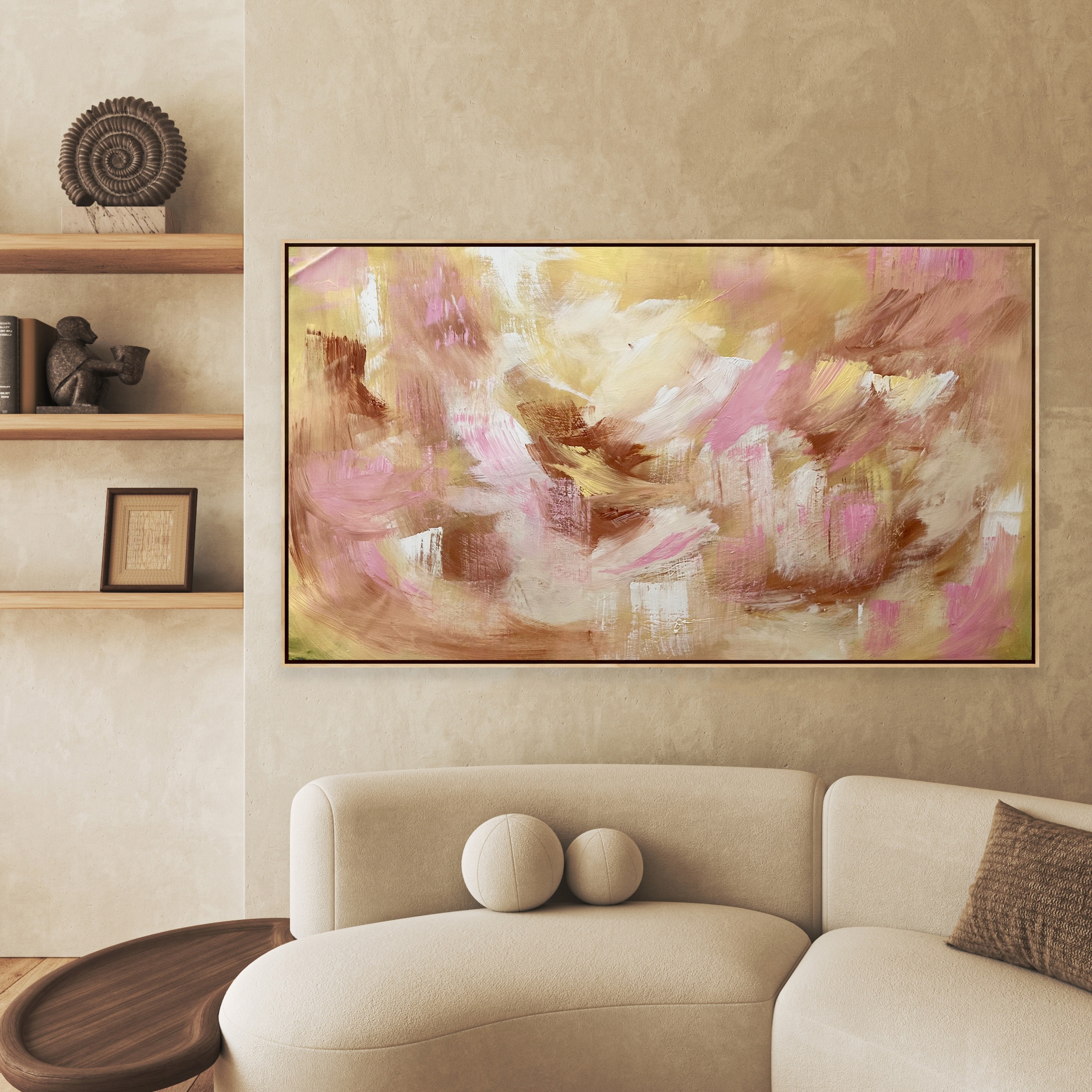 Calming muted shades in modern earthy textured strokes, this beautiful painting adds to a calming environment.