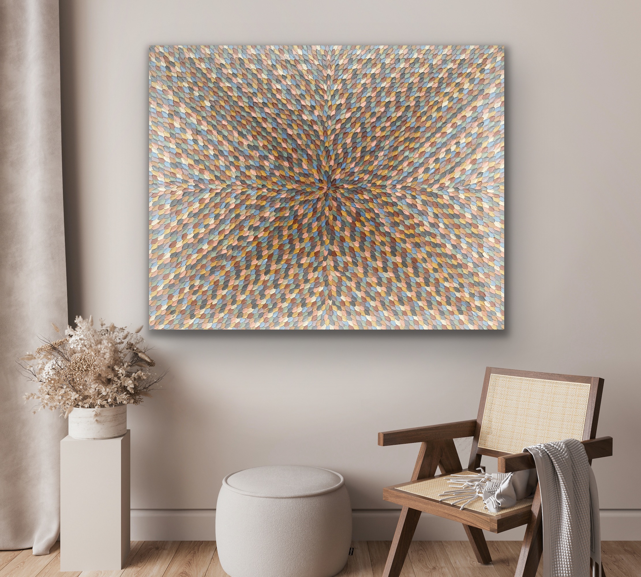 I am excited to bring my geometric optical art abstracts to you. My abstract range takes you into fascinating world of optical illusions. Particular effects are achieved by introduction of rhythmical repetitions and drastic or balanced contrasts in tone or colour. The use of light and tone make some of the series glow. Some of the pieces disrupt our vision and make it hard to interpret painting in conscious way. Some of them look like visual puzzle. My art have impact on viewer: for some it is calming and soothing, for others it will help to concentrate or cause certain reaction. I love creating artworks that people have emotional response to and feel connected in some way.