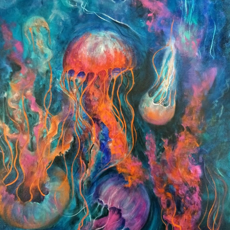 Above the Sea by Kathryn Johnston –Â Aerial view of the ocean waves flowing over the rocks rocks. I love painting the ocean and the rocks or anything in nature when I want to free up my brush strokes and just paint.