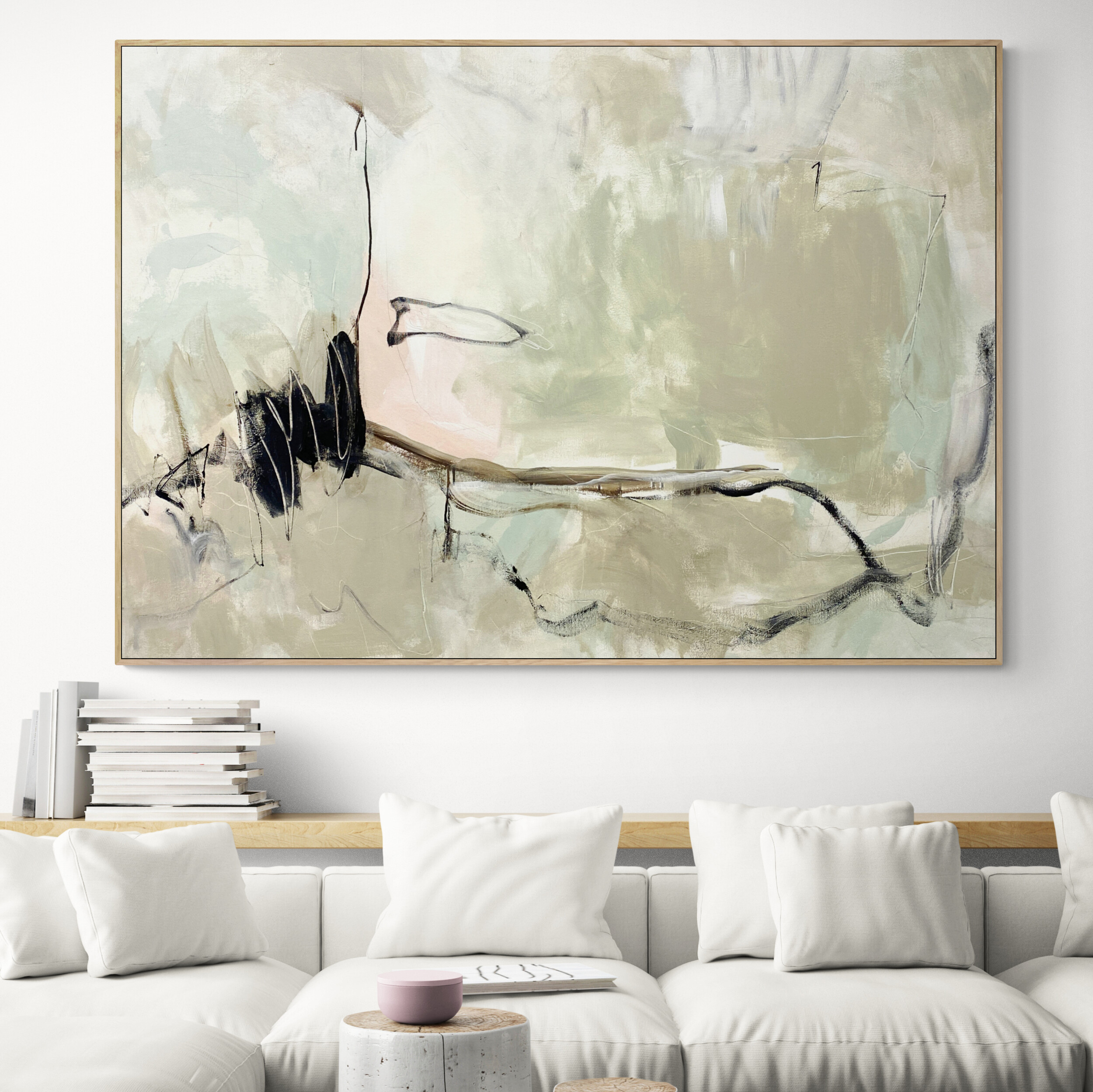It’s intriguing mark making combined with its restful and calm palette of beige and beautiful soft blush and subtle greens, mixed with brown, white, and neutral tones all dancing around bold black line work.