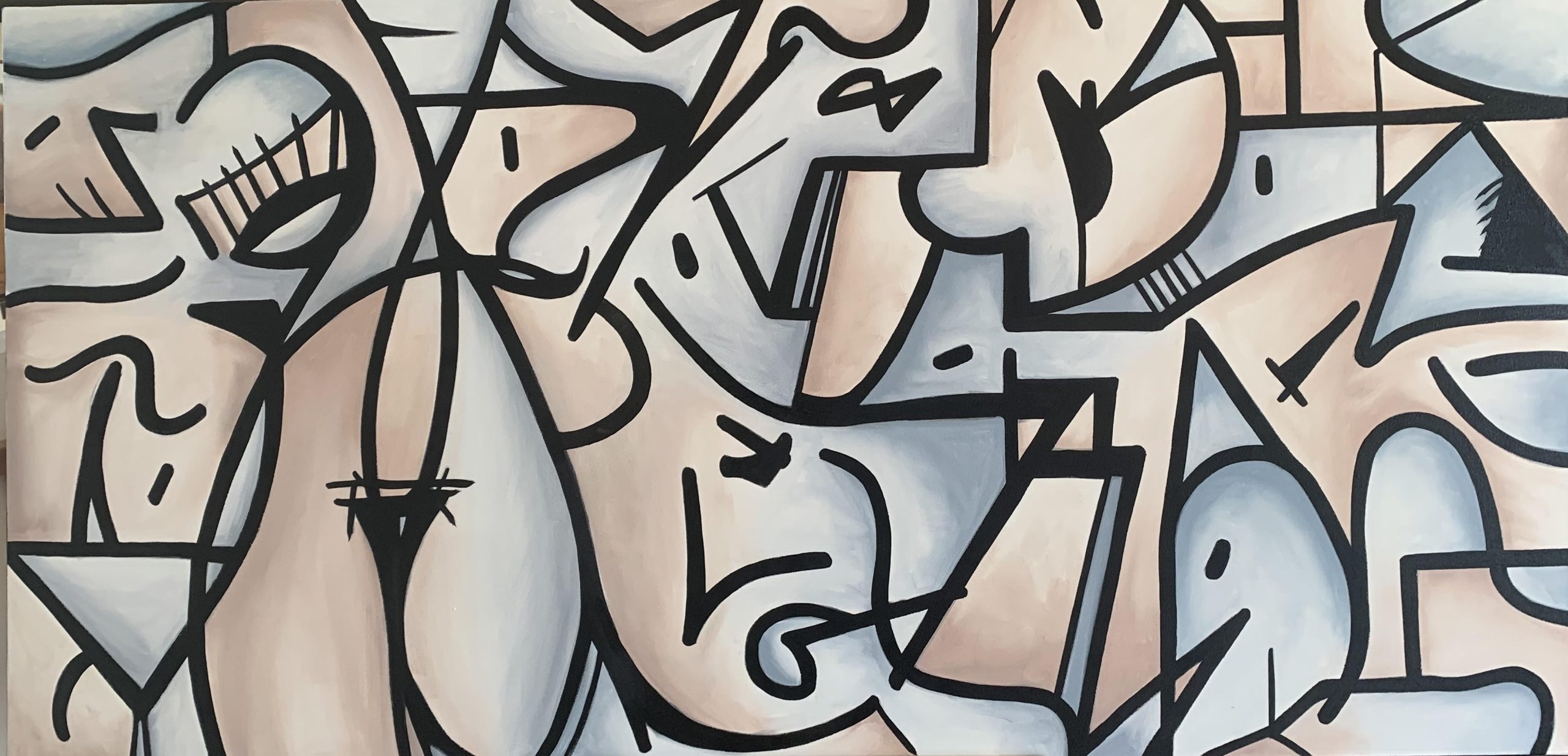 An original abstract oil painting by Kevan Rigby – using professional oils on a stretched quality canvas, An abstract painting of human form contrasting inanimate with animate.