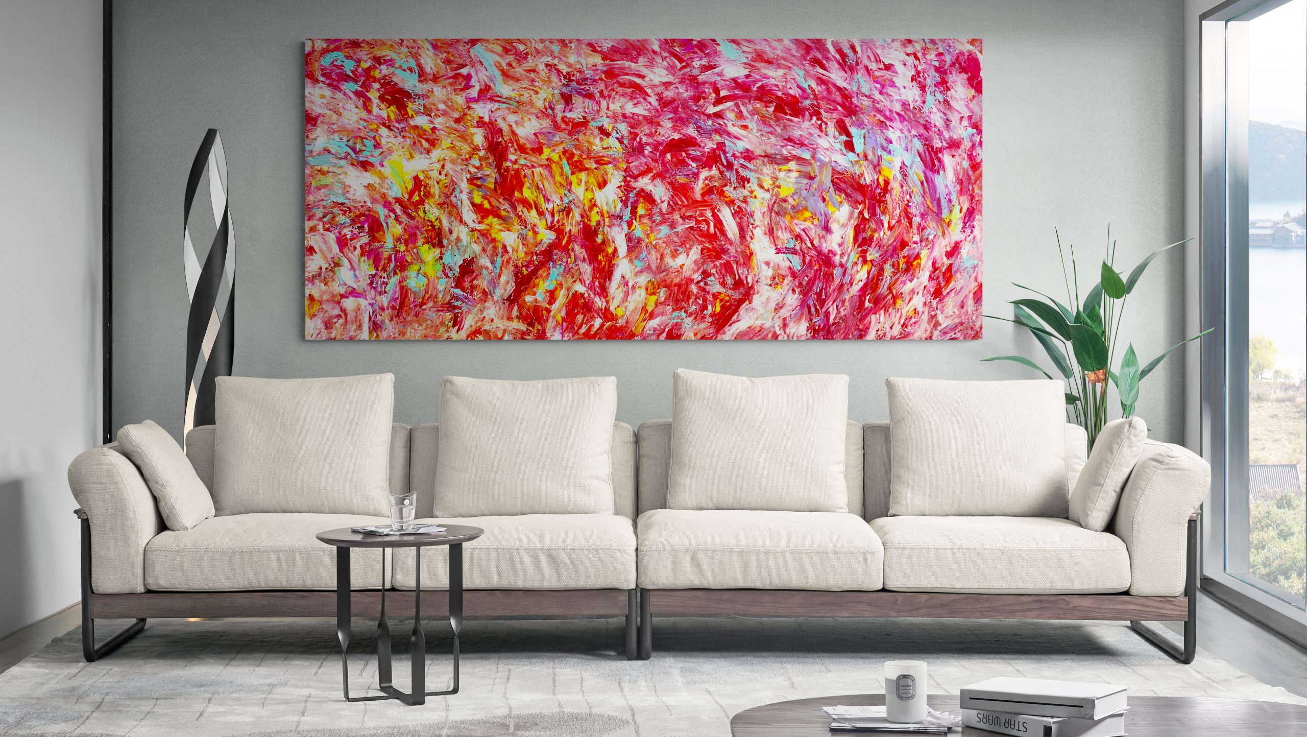This artwork is painted on professional-grade canvas stretched and sealed with varnish. The canvas has dimensions 225 cm in width by 100 cm in height. The painting wraps around the sides of the stretcher, so the sides are painted in the same style as the surface. As such it does not need a frame.