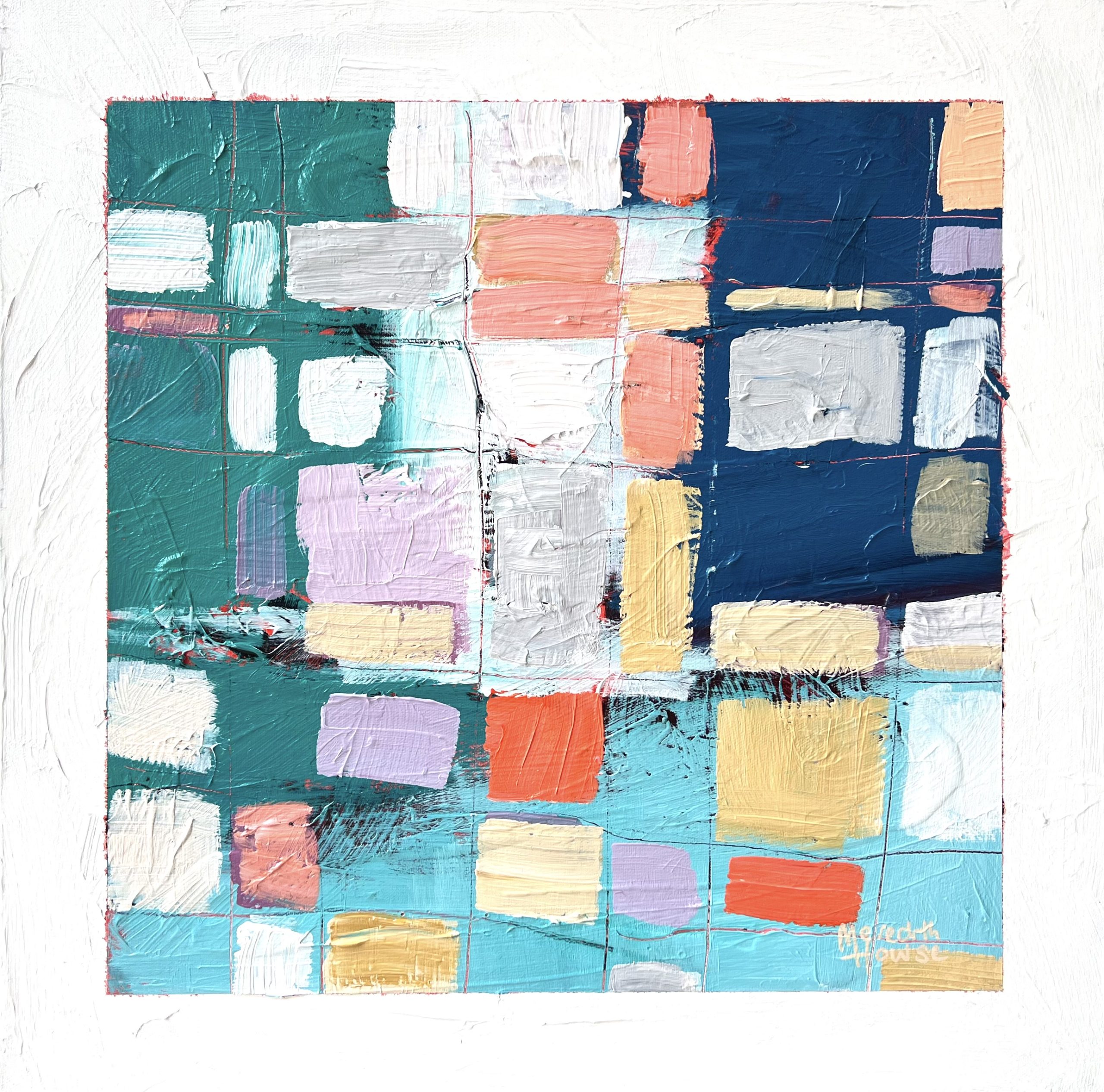 Beautiful Turquoise blues, pinks and white artwork is surrounded by a crisp white painted border.