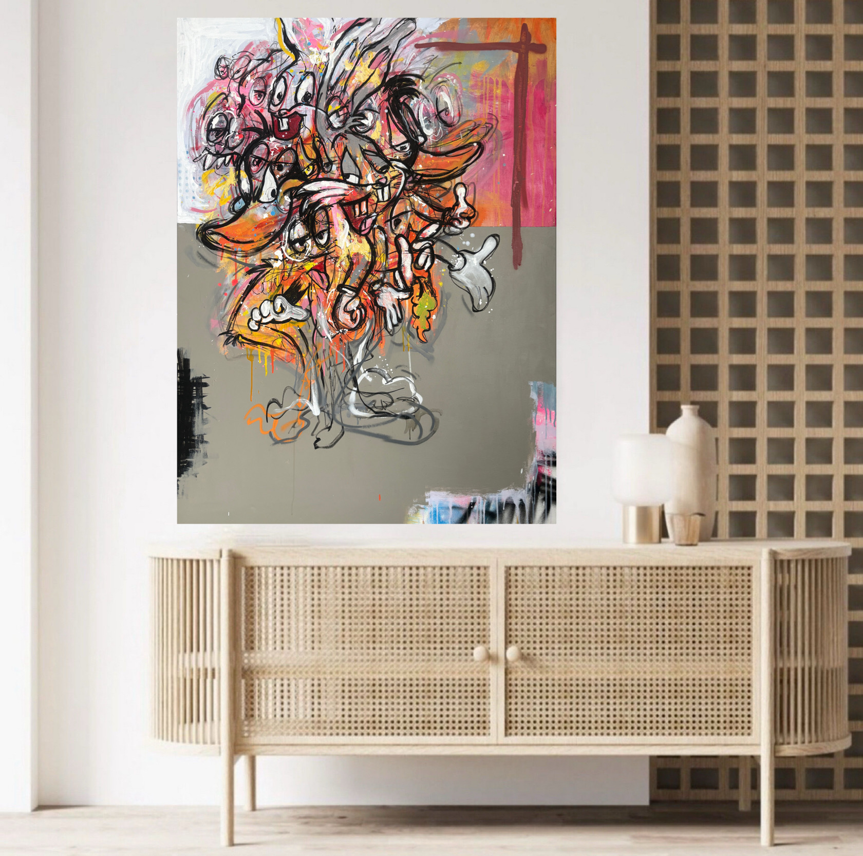 This painting features animation characters Buggs Bunny, Daffy Duck & draws inspiration from Graffiti and Street Art, with the composition inspired by Frances Bacon.