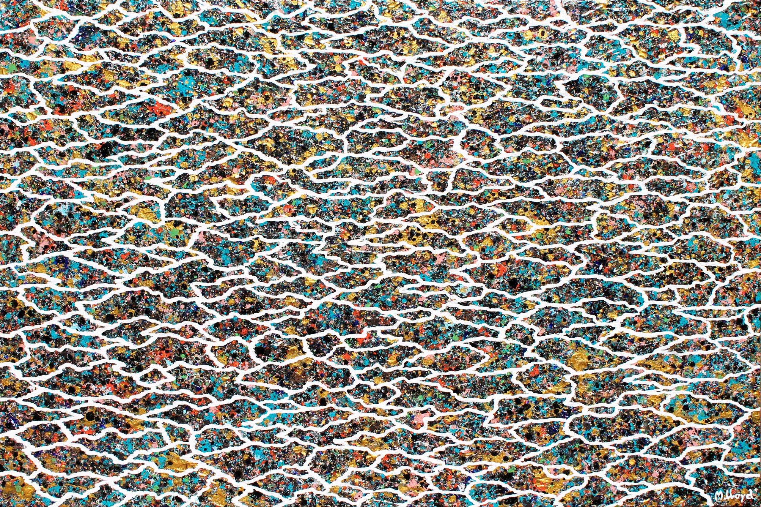 Part of my line art series this one was inspired again by my morning runs through the Adelaide Hills inspired by the bark on the trees that surround me. This one can also be hung landscape or portrait. Loving the metallic golds in this one. A mix of deep browns, blacks, blues, greeny blues, turquoise, whites, metallic golds, silvers, orange, greens, pink and beige. Finished with a gloss finish to saturate the colours. Ready to hang landscape or portrait. This painting would also compliment my Gum Trees painting in the 100cm x 100cm format as has the same background.