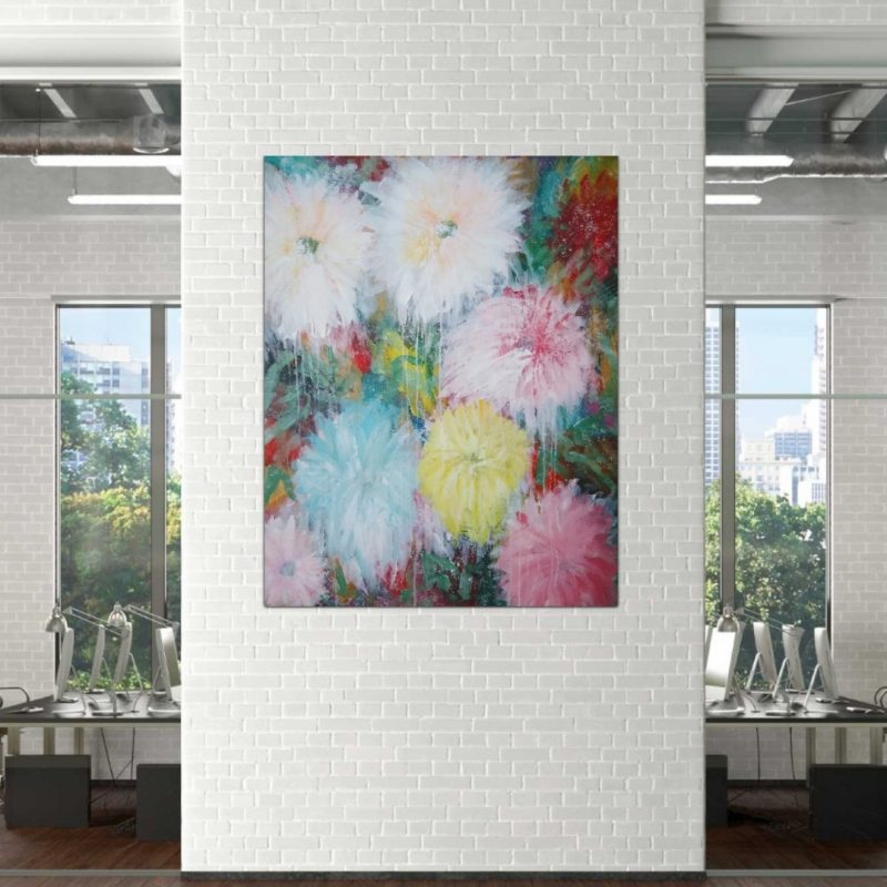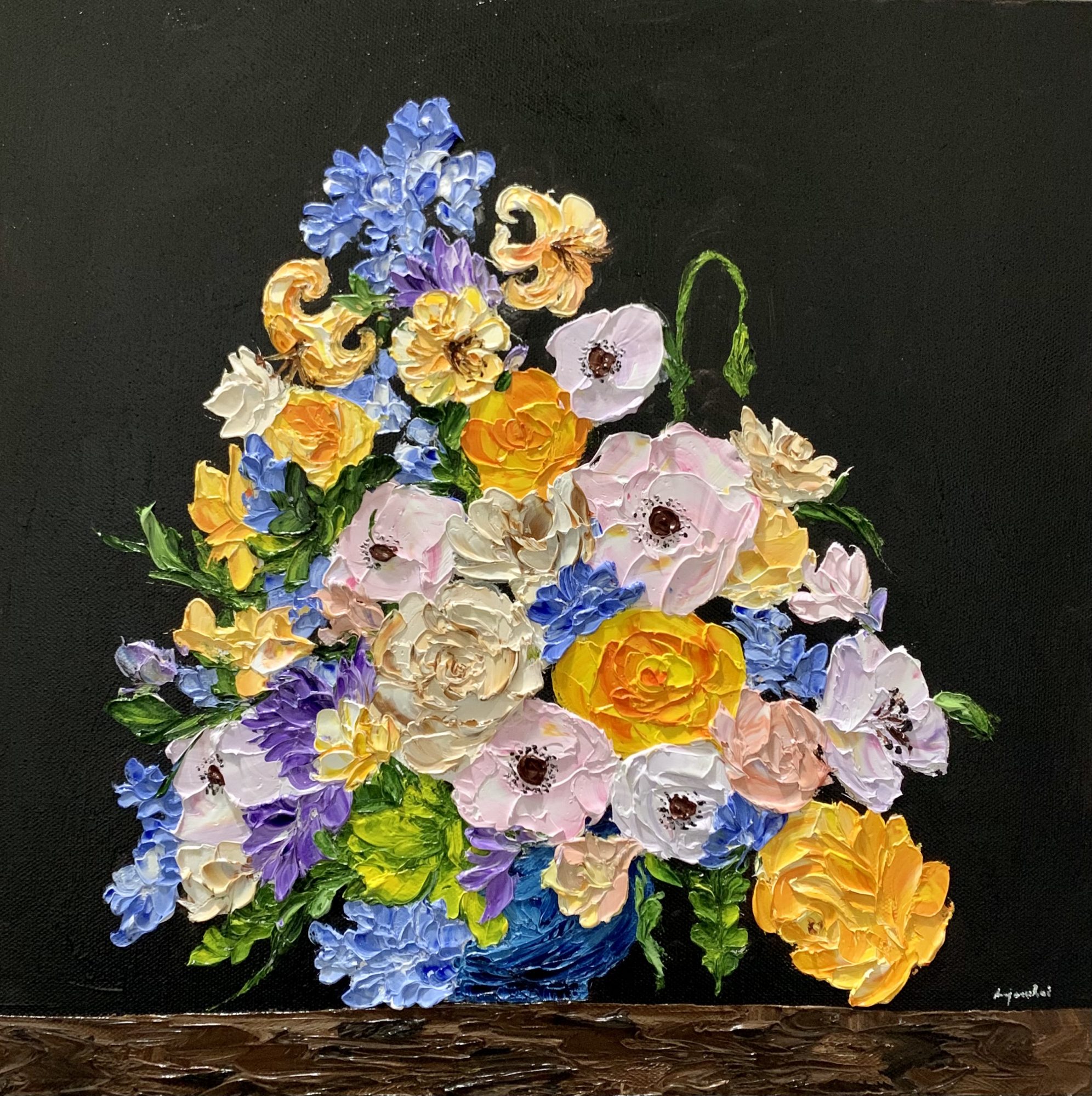 ‘Abundance’ is a still life painting inspired by Spring and the beautiful Australian flora. Original artwork by Anjana Rai. This artwork is made using impasto technique with palette knife and is framed in natural timber ash wood floater frame, ready to hang. Comes with signed certificate of Authenticity.