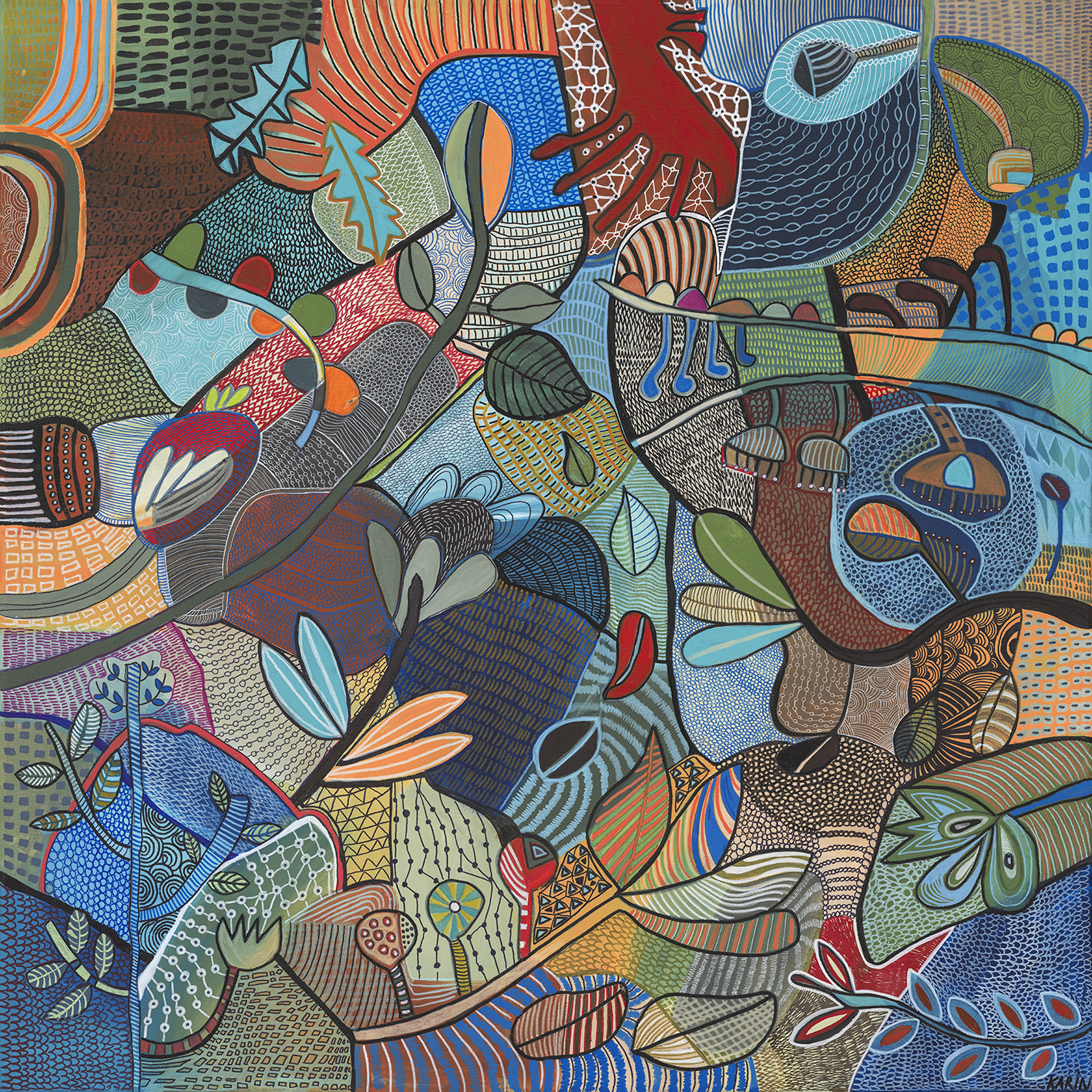 I am inspired and visually stimulated by the natural environment that surrounds us such as plants, leaves, botanicals,  bush-nuts, seed pods, and all organic products of the landscape. My work has a strong focus on the patterns, shapes, colours and the rhythm of the land. I stylise my designs rather than formalise them, with the intention to create the joy, beauty and complexity of the elements found in nature. Colour and mark making is a strong focus and key component of my work, where the work becomes detailed and complex in areas. The art work almost takes on the appeal of a textile or a tapestry. The intricate lines and patterns move the eye around the canvas to find a composition within a composition, creating a story or medley of abstract plants. Mixed media includes acrylic paint, acrylic paint pens and ink pens. The work is layered and developed with paint then the design is added, followed by the mark making process which is added mark by mark. Abundance provides and supplies the viewer with an abundance of colour, organic plants and botanicals, giving an overflow of the fullness of nature.