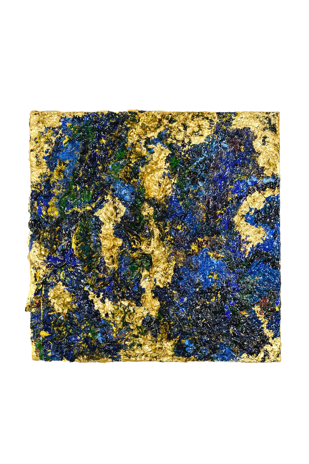 Plaster of Paris and mixed media acrylics covered with gold leaf on wood board