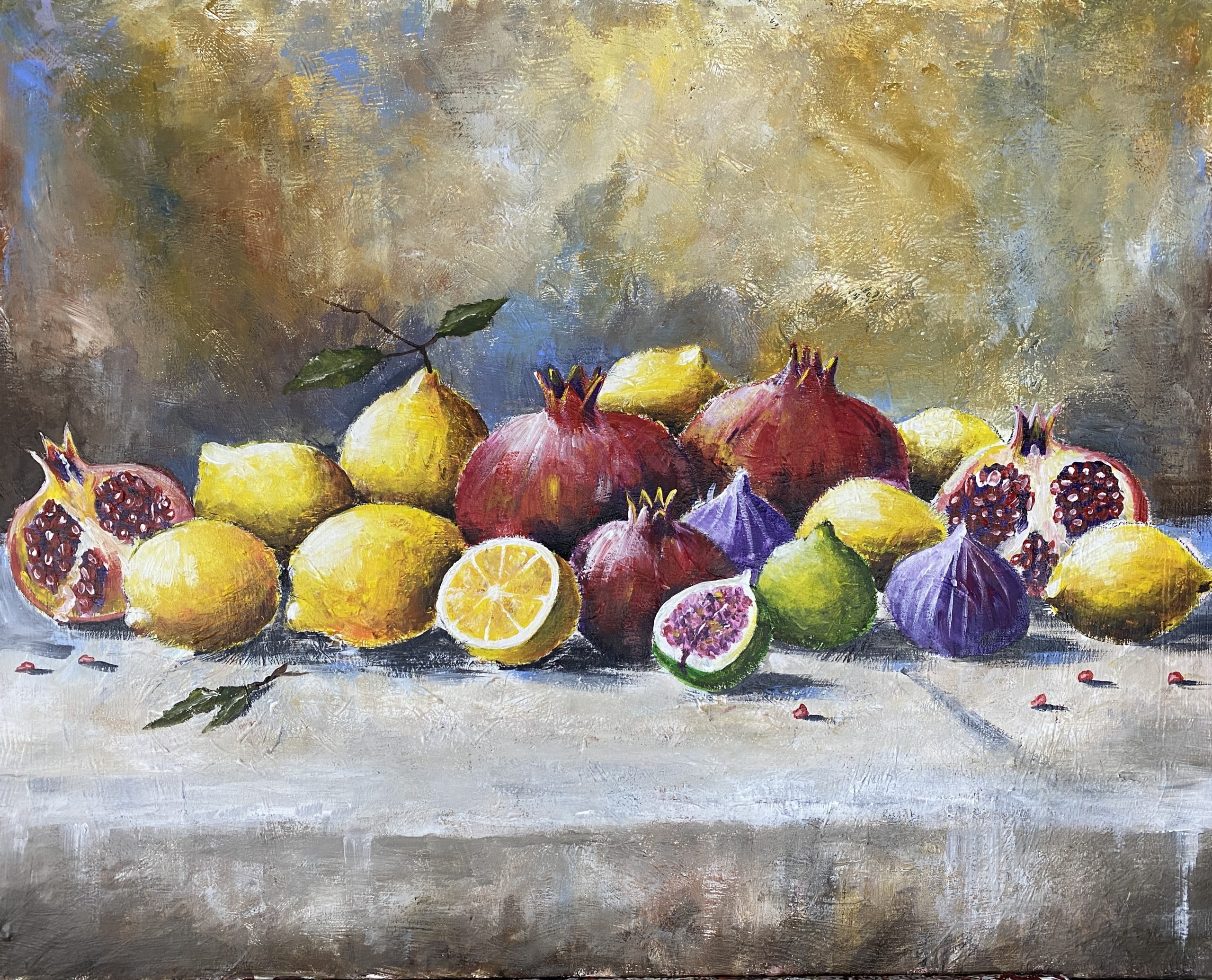 Abundance by Mark Rein is a vibrant celebration of nature’s bounty. This original acrylic still life features a lush array of pomegranates, lemons, and figs bursting with rich colours and textures.