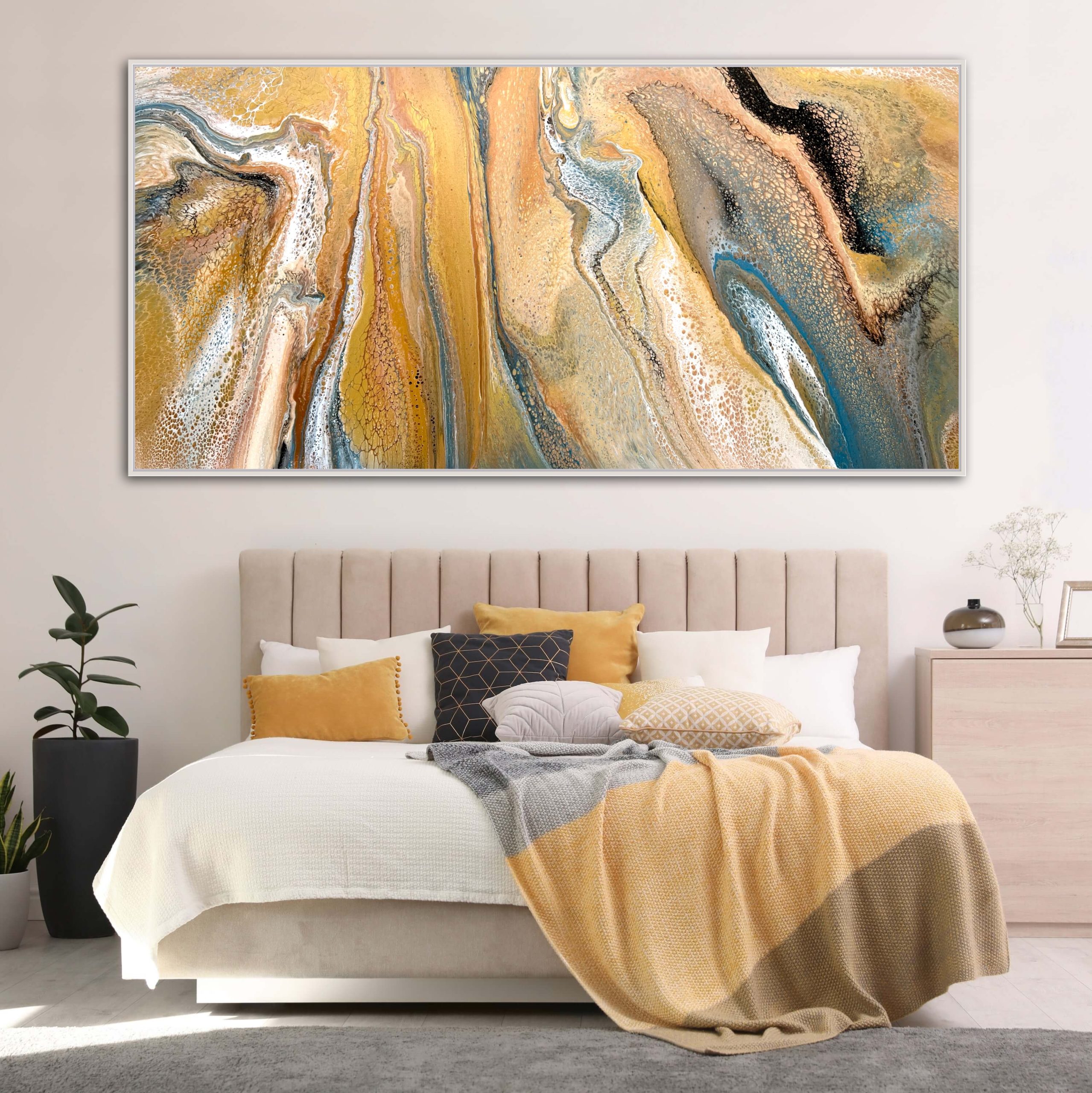 Abundant Earth was created using various techniques combined to allow increased flow, interaction and separation of colours to create interesting patterns where pops of colour can be seen emerging from underneath. This added dimension adds lace and cells to the artwork creating an interesting and one of a kind painting that can never be replicated. A gorgeous variety acrylic pigments were used including metallic yellow & rose gold, bronze, touch of copper, silver, cream, brown, grey, blues, green, black and white.