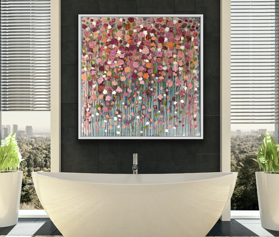 101.6cm by 101.6cm of sheer joy and love with painted deep edges, gallery wrapped stretched premium cotton canvas varnished for protection and luster, has d-rings and wire to hang.
