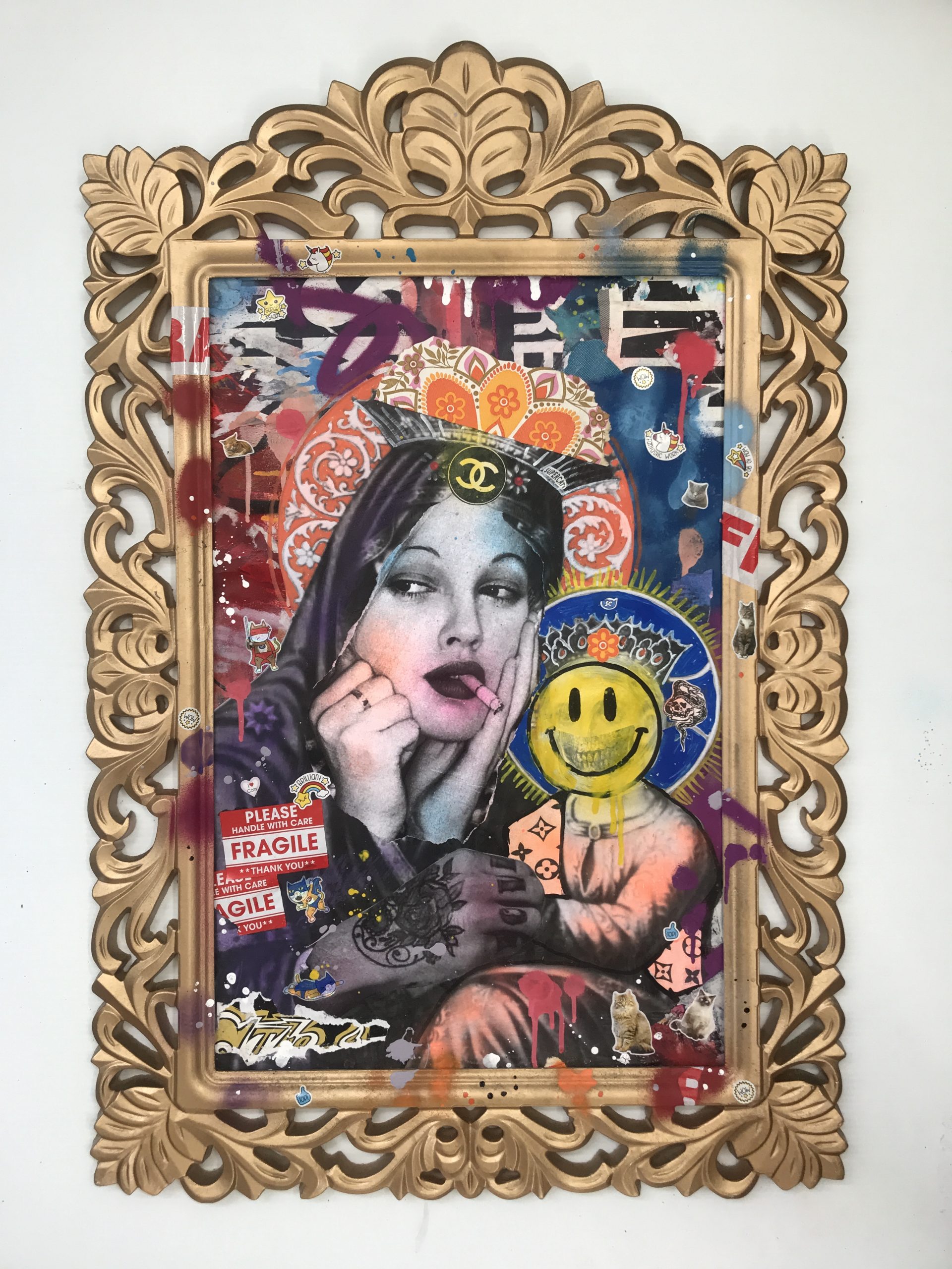 The main vintage icon was added & framed in a Traditional Chunky Vintage Gold Frame which juxtaposes the Modern Urban Pop Art, this work was finished off with stickers and is under a protective clear sheet.