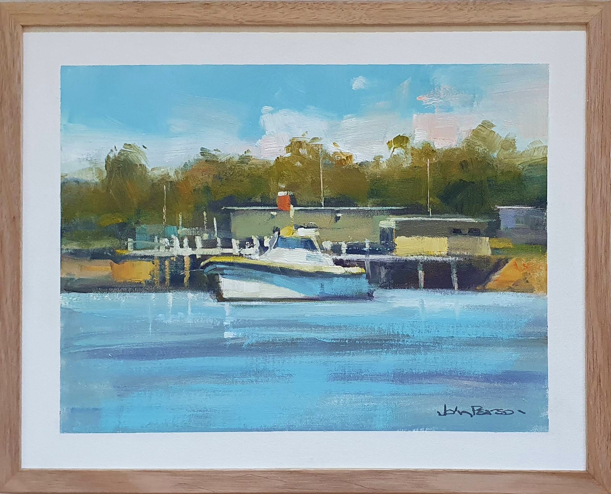 Across The Bay- by John Pearson – it was a perfect spring afternoon as I set my easel up on the banks of a local river. A fishing boat and warehouses helped set the scene which I really enjoyed painting.