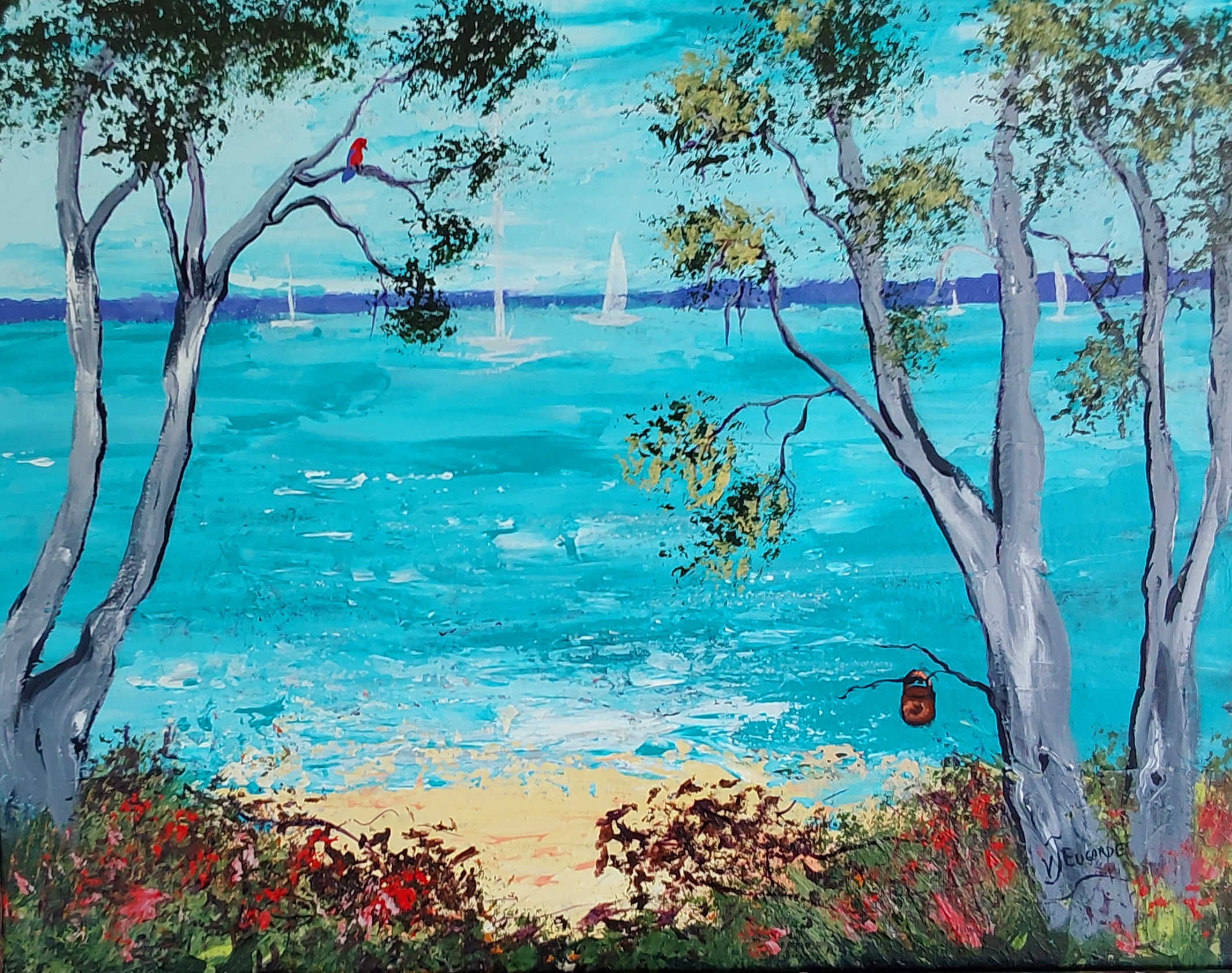 Across The Bay by Valerie Eugarde – This piece is a view across the bay from my tiny island home in Queensland , it changes daily depending on the weather conditions as sometimes there is not a single wave on the bay, this day was breezy and the bay was a little rougher than normal.