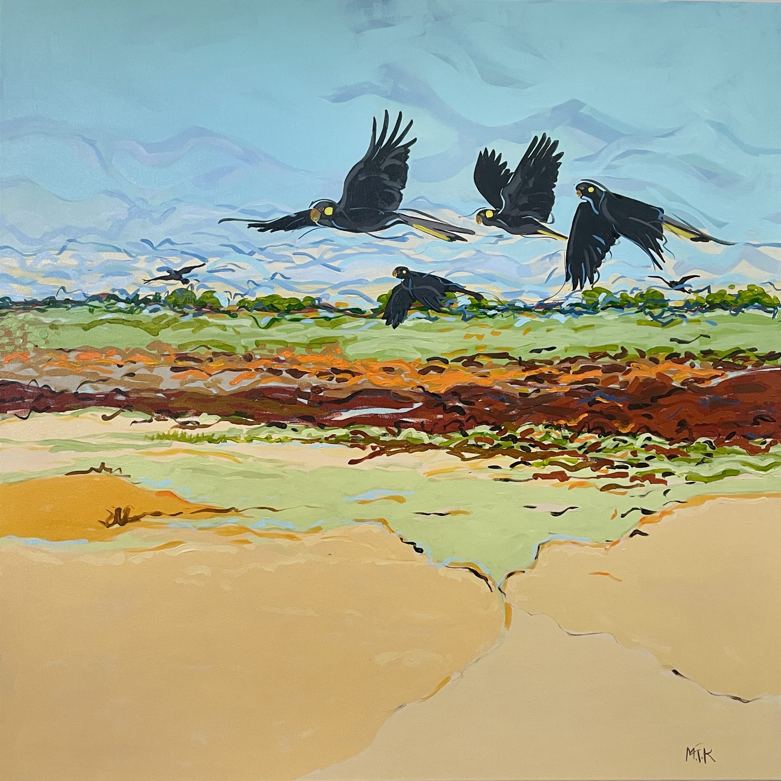 Black cockatoos soaring over a colourful landscape.