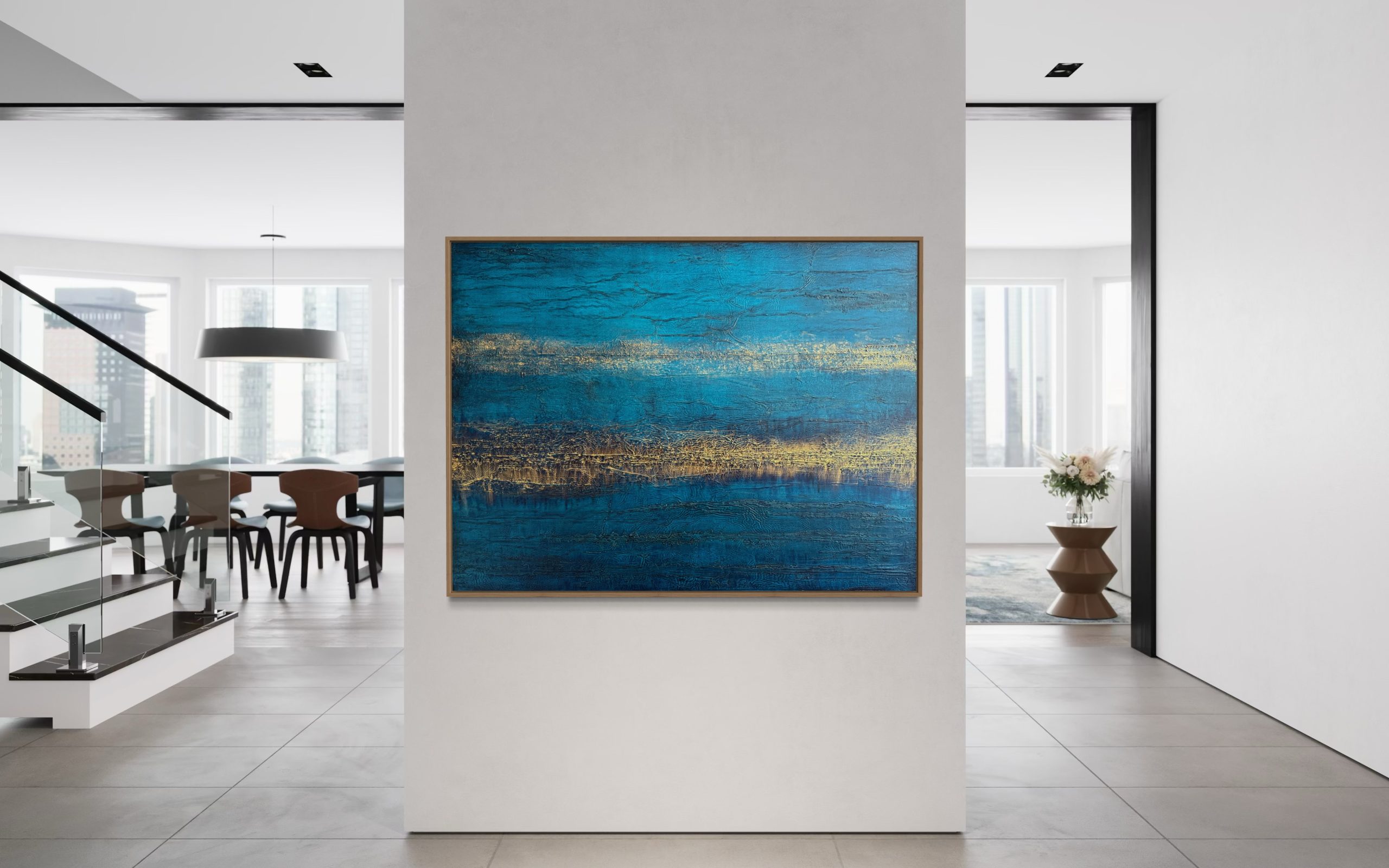 Across the Universe by Nadine Hobson – Looking out over the ocean late in the day, as the sun dips below the horizon and the water catches those final reflections. It’s that magical moment of gazing out into the distance and feeling like you could be transported elsewhere. This statement piece features lots of texture in the most beautiful shades of deep blue, highlighted with gold. The multitude of layers creates many detailed areas and the metallic gold will shimmer and shift depending on the light, which provides a slightly different vista throughout different times of the day. It is calming and contains a sense of gentle movement, bringing a beautiful presence to any room.