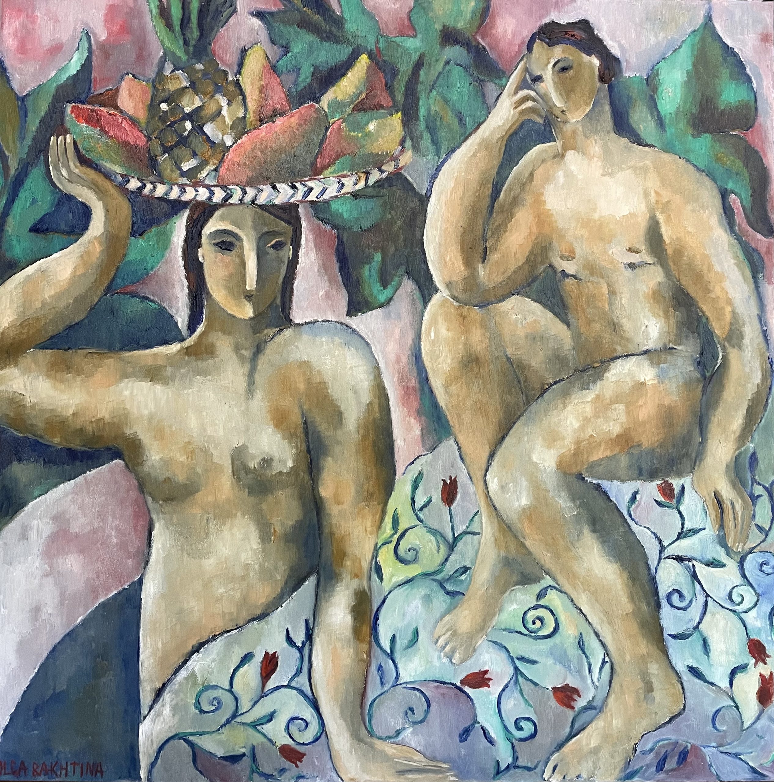 Adam and Eve II is one of the paintings from Olga Bakhtina‘s series ‘Inner Garden, Secret Garden’ which is a collection of paintings in which every work is a story being told. It’s an attempt to create a dreamy new world of harmony, a civilisation of peace and serenity, where dreams come true, and worries do not exist. The series is about humanity, about what truly matters: love, romance, keeping childhood dreams, believing in miracles, the love of adventure, and finding harmony. It is an optimist’s visual feast in which I honour the human spirit, strength, and courage. Artistically, the series is about finding harmony through the balance of colours and geometrical shapes. It is also about finding a stylised metaphorical language, a kind of a child’s simplified way of telling a story. Through the classical approach with a contemporary twist, the series was an ambitious attempt to give the images the air of a parable, as well as the grace and grandeur of Renaissance frescoes. Size: 91cm x 91cm x 4cm. Ready to hang. Edges painted black. Can be hung framed or unframed.