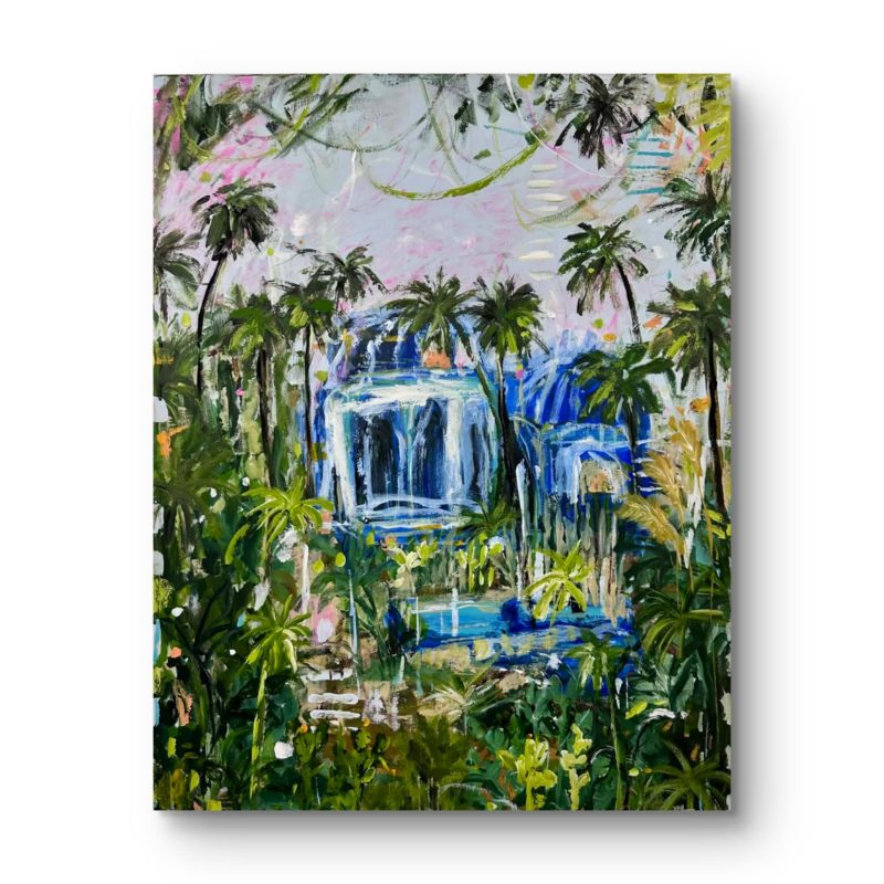 Brush strokes are bold and semi rough, while dark navy, white and green are the dominant colours. This mix creates cohesion making the figures pop against the background and contrast against the Lime of the plants, deep orange and gold.
