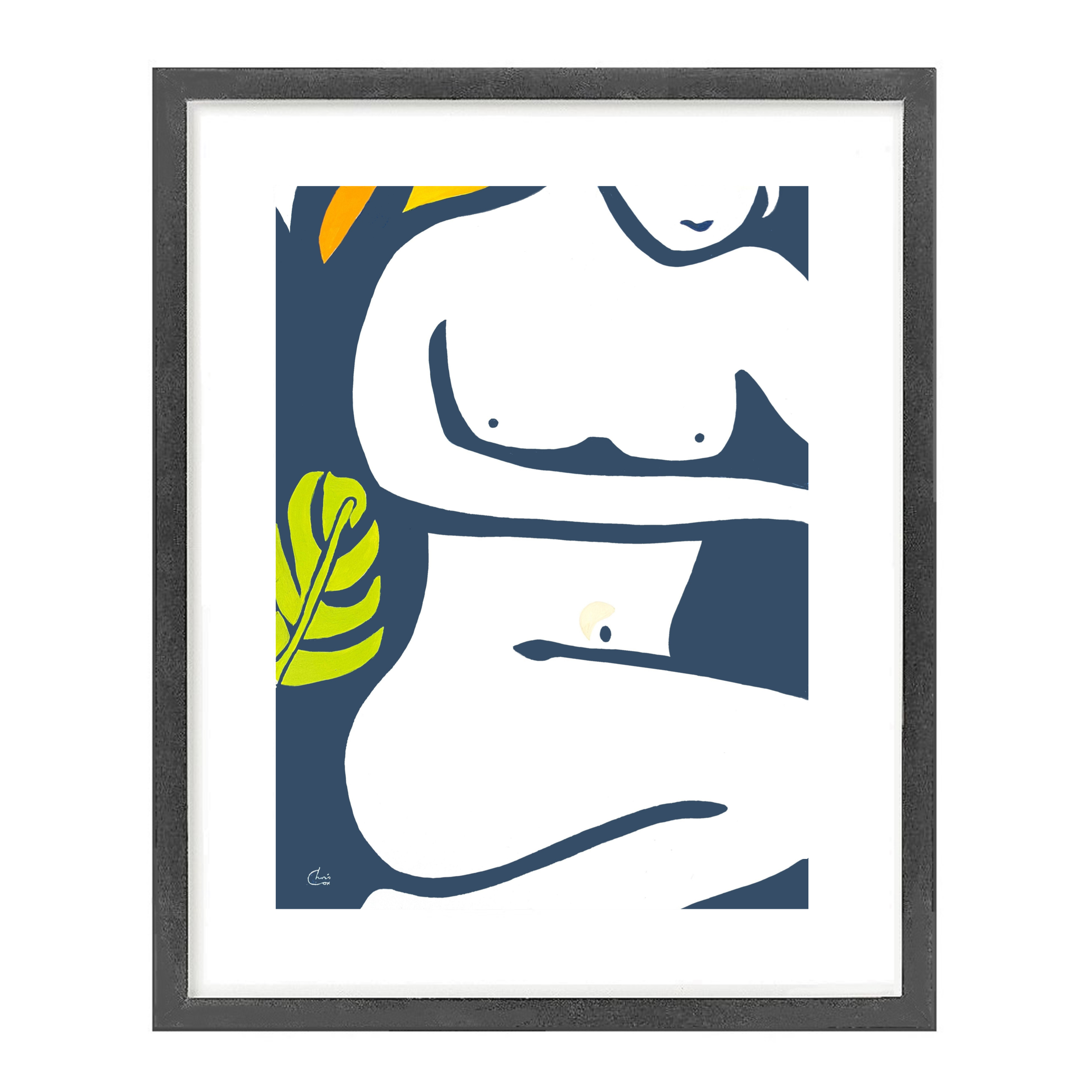 Brush strokes are bold and semi rough, while dark navy, white and green are the dominant colours. This mix creates cohesion making the figures pop against the background and contrast against the Lime of the plants, deep orange and gold.