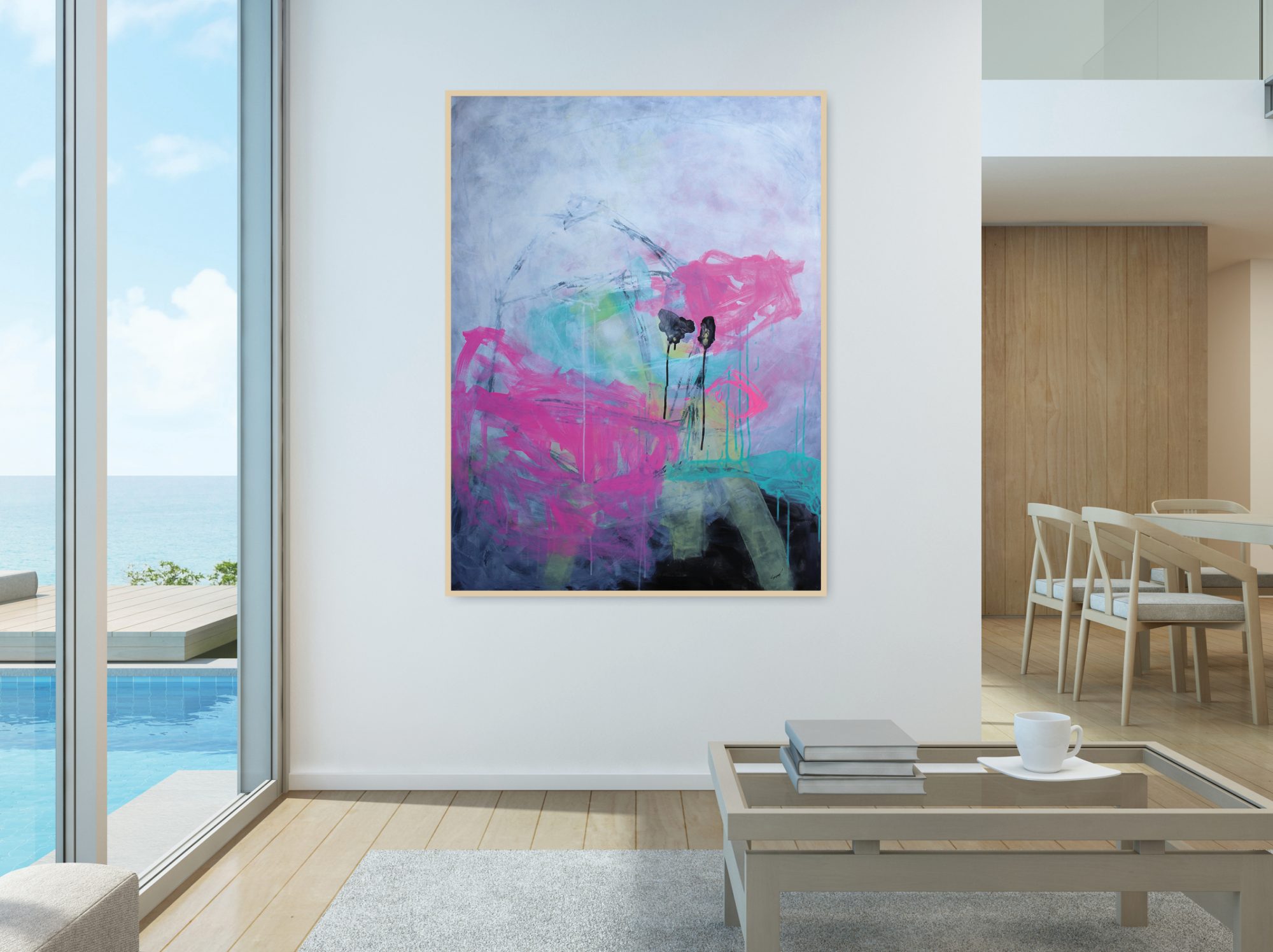 Looking for a contemporary painting? This original painting was one of two finalists pieces in the prestigious Minnawarra Art Awards 2017. It is a large piece measuring 90cm wide x 120cm high and is professionally framed with gorgeous 2cm light oak. As it is painted onto wood, it has no glass covering it. The materials are acrylic paint and oil stick, finished with three coats of varnish, so easy to dust if required. Ready to hang.
