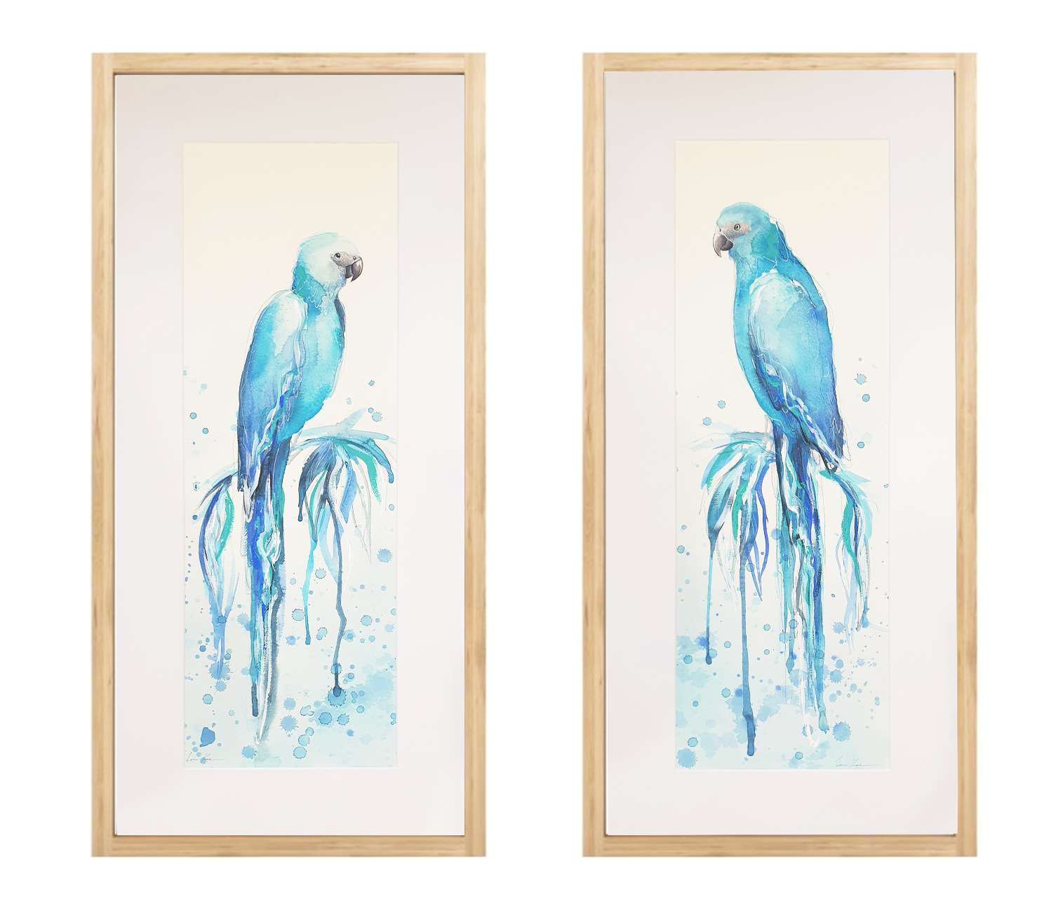 Adoration in Blue, Spix’s Macaws by Leni Kae – An original watercolour and acrylic painting set (2 piece) of two Blue Spix’s Macaws, adoringly looking at one another. The blue Spix’s Macaws are among the rarest birds in the world; so symbolically, this painting set represents finding a rare kindred spirit. Created with watercolour with highlights of acrylic and pencil on 300gsm paper, and including a matt board mount per artwork. Requires framing. This artwork is from Leni Kae’s series titled “Animal Spirit”. A beautiful romantic and joyful investment for an art collector or gift for a birdlover.