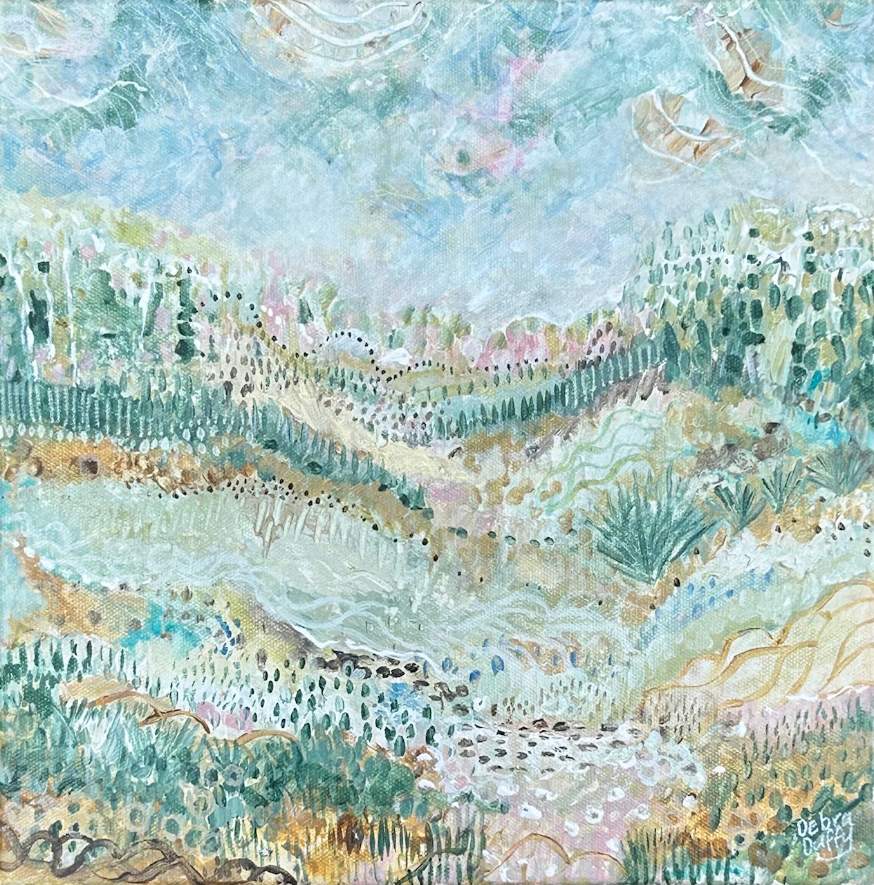 This original abstracted landscape consists of acrylic paint, gauche and artist markers and is part of my Dreamscapes series that holds a story around my intuitive response to emotion and place. This artwork reflects the quiet joy and connection found on my bushwalking trails. Through layered textures and soft organic movement, I explore the sensory discoveries that continually inspire me. These small adventures offer space for rejuvenation and reflection while walking through natures rhythms. ‘Adore’ celebrates the quiet intimacy between the landscape and inner stillness and is a visual expression of gratitude. This colour palette is soft, earthy and gentle with textures and patterns highlighted with a dappled sky featuring whispers of swirling patterns. Thankyou for visiting and hope you enjoy discovering this piece x