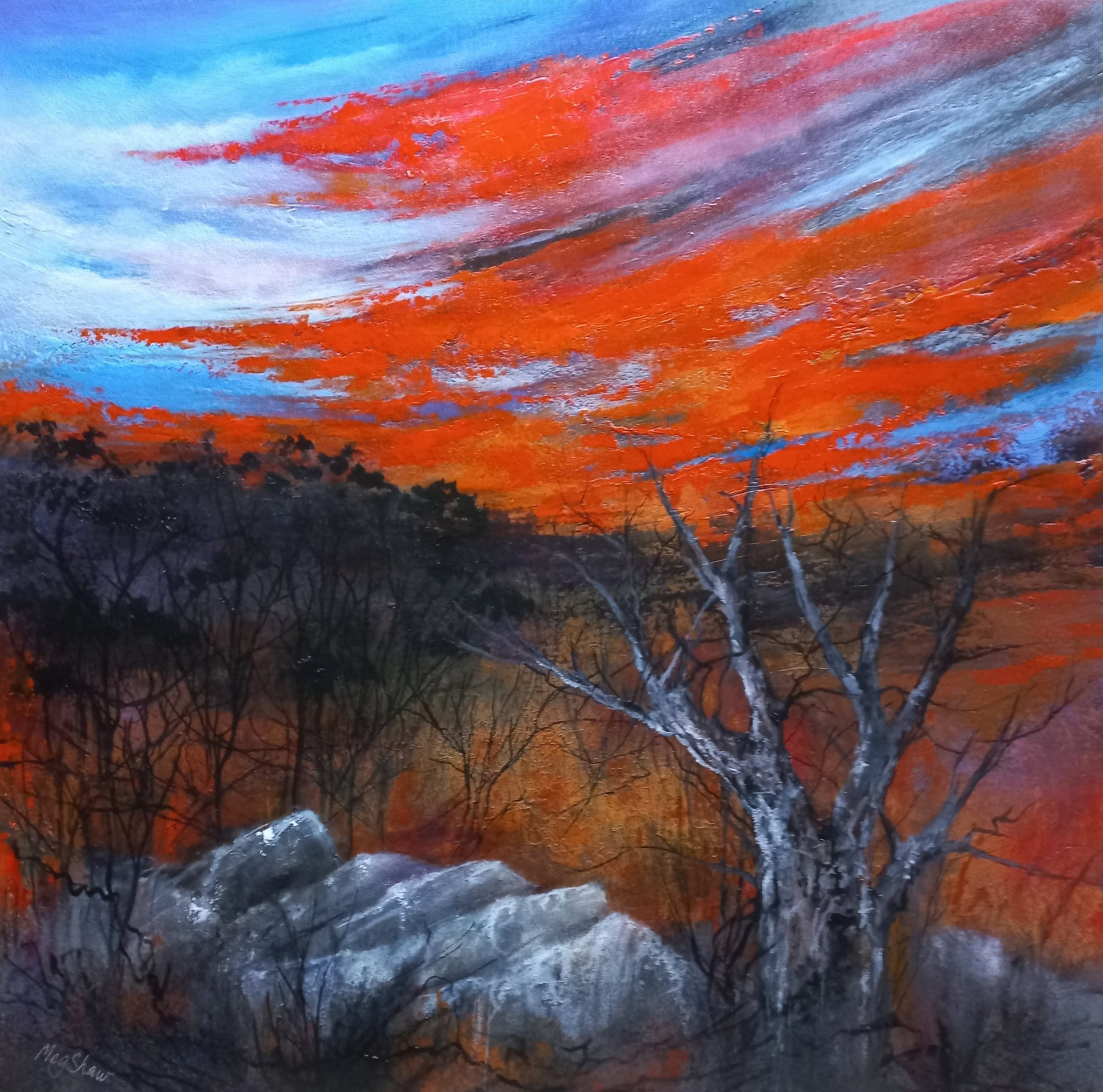 I was inspired to paint this artwork after reflecting on Australian Indigenous Communities and their deep, spiritual connections with this ancient land. For example, Arrernte people use words like tjuringa (sacred) and ahelhe (earth). ‘Aeon’ is the result of these reflections. It’s not an impression of any particular space in Australia, but rather it’s a collection of images and memories from various areas I have seen. Some people have commented that they see The Grampians, Flinders Ranges, Central Australia or Western Australia when they look at ‘Aeon’. My intention is to evoke emotions and memories for viewers, so ‘Aeon’ is what you see and feel on a personal level. Some comments have included words such as: atmospheric, emotional, passionate and impactful. I’m grateful to American artist, Hartini Gibson for her reaction, “… exceptional work. You have created a moment that feels like it is an ‘always’, but also a new moment, at the same time. Staring into this moment gives an unexplainable sense of conformation and peace.”