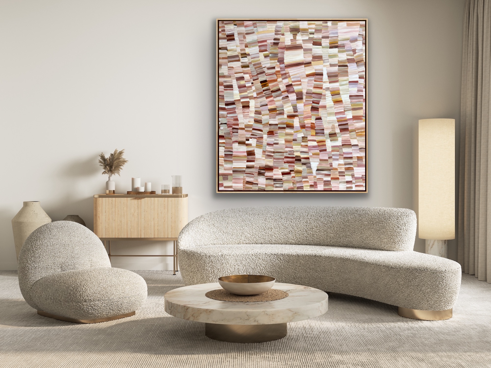 Aerial Display by Theo Papathomas is a similar painting of mine seen on The Block this year, is looking at the Australian outback from above observing the different shades of the landscape painted in acrylic paints on canvas. This artwork was inspired by the beautiful colours of the landscape. I wanted to capture the movement and the beautiful rhythms of the land. Capturing the beautiful light colours of the landscape, transporting the viewer into a contemporary view of the outback. I tried to create so much depth in the painting .A very harmonious composition of colours and forms that makes it a very peaceful and tranquil painting. The painting does not come with an external frame.The painting is signed and dated 2022 at the back and comes with a certificate of Authenticity.