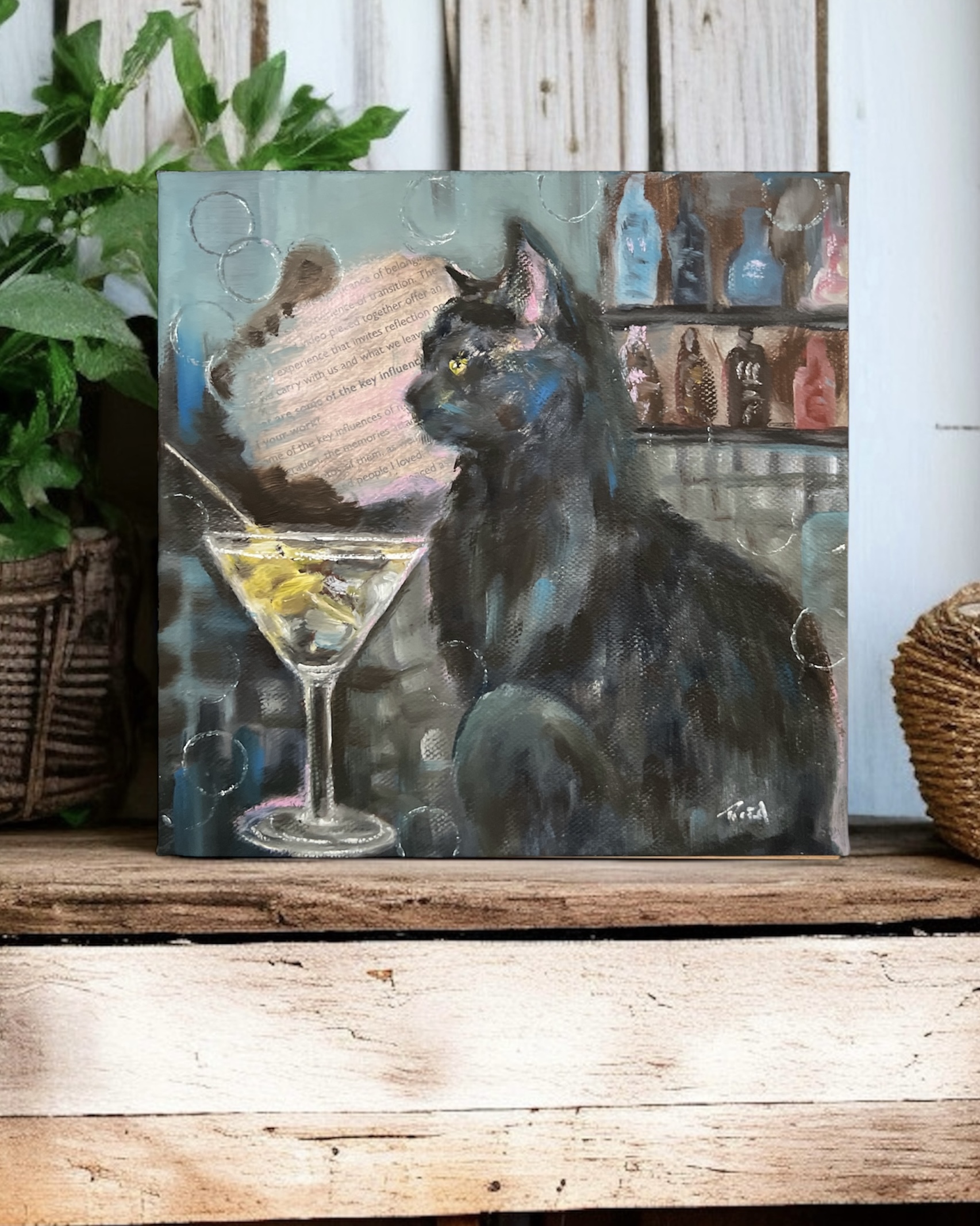 After Hours is an original oil painting where I explore stillness, atmosphere, and the quiet stories that unfold late at night. I painted this black cat in profile, looking to the left, calm and observant. A cocktail sits on the table beside her, suggesting a moment paused — reflective, solitary, and slightly mysterious.