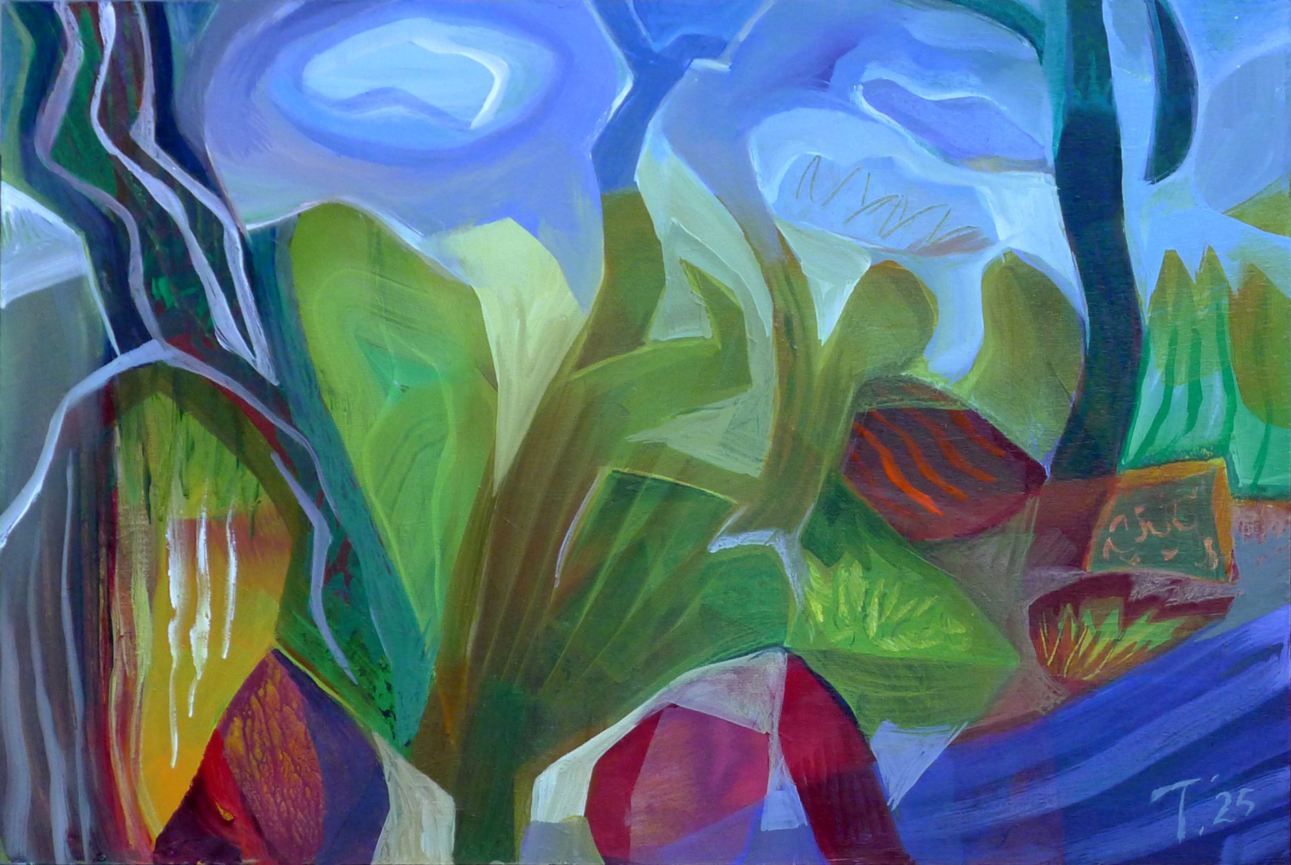 In After the Rain, I conjure a vision of the forest renewed—an abstracted, ecstatic landscape that pulses with post-rain vitality. Swirls of cloud, verdant leaf forms, and crimson earthen shapes rise in dialogue, evoking nature’s emotional and mythic consciousness. Gestural brushwork and layered colour planes create a sense of vegetal movement and atmospheric memory, suggesting that the landscape is not merely observed but felt—a psychic and spiritual terrain. Echoes of myth—rain as divine weeping, forest as world-body—imbue the work with archetypal resonance.