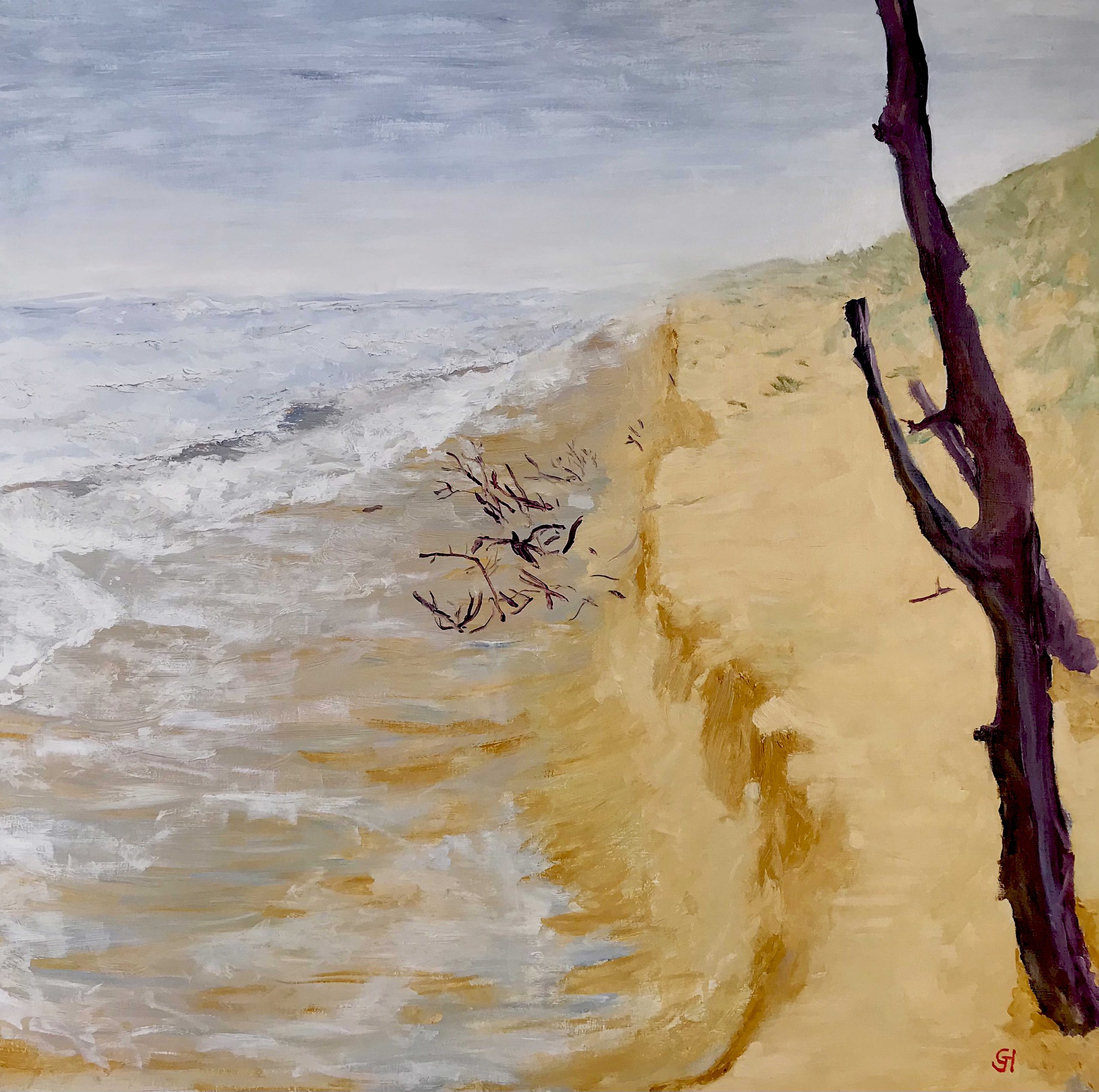 A heavy surf was still running and the salt haze restricted visibility. Oils on a cradled wood panel, sides painted black, unframed with a wire across the back, ready to hang.