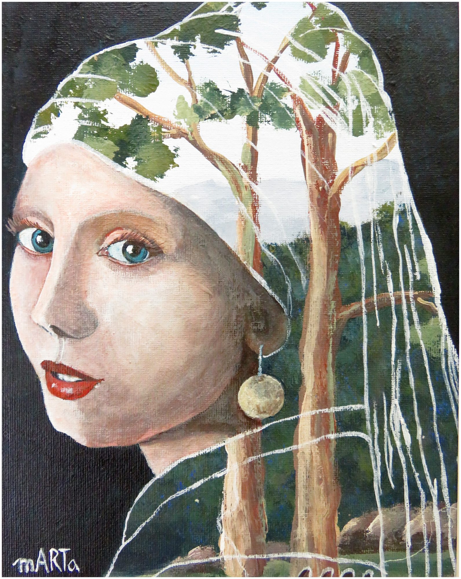 Wouldn’t we all like an original Vermeer in our home? This original painting was inspired by Vermeer’s ‘Girl with the Pearl earring’ and I gave it a slightly different aspect. Vermeer’s paintings were mostly very detailed portraits but rarely did he incorporate landscape into his paintings. In this ‘Appropriation’ of the Girl with a Pearl Earring, I have replaced the girls headscarf with the painting of a landscape to combine landscape and portrait in an abstract version.