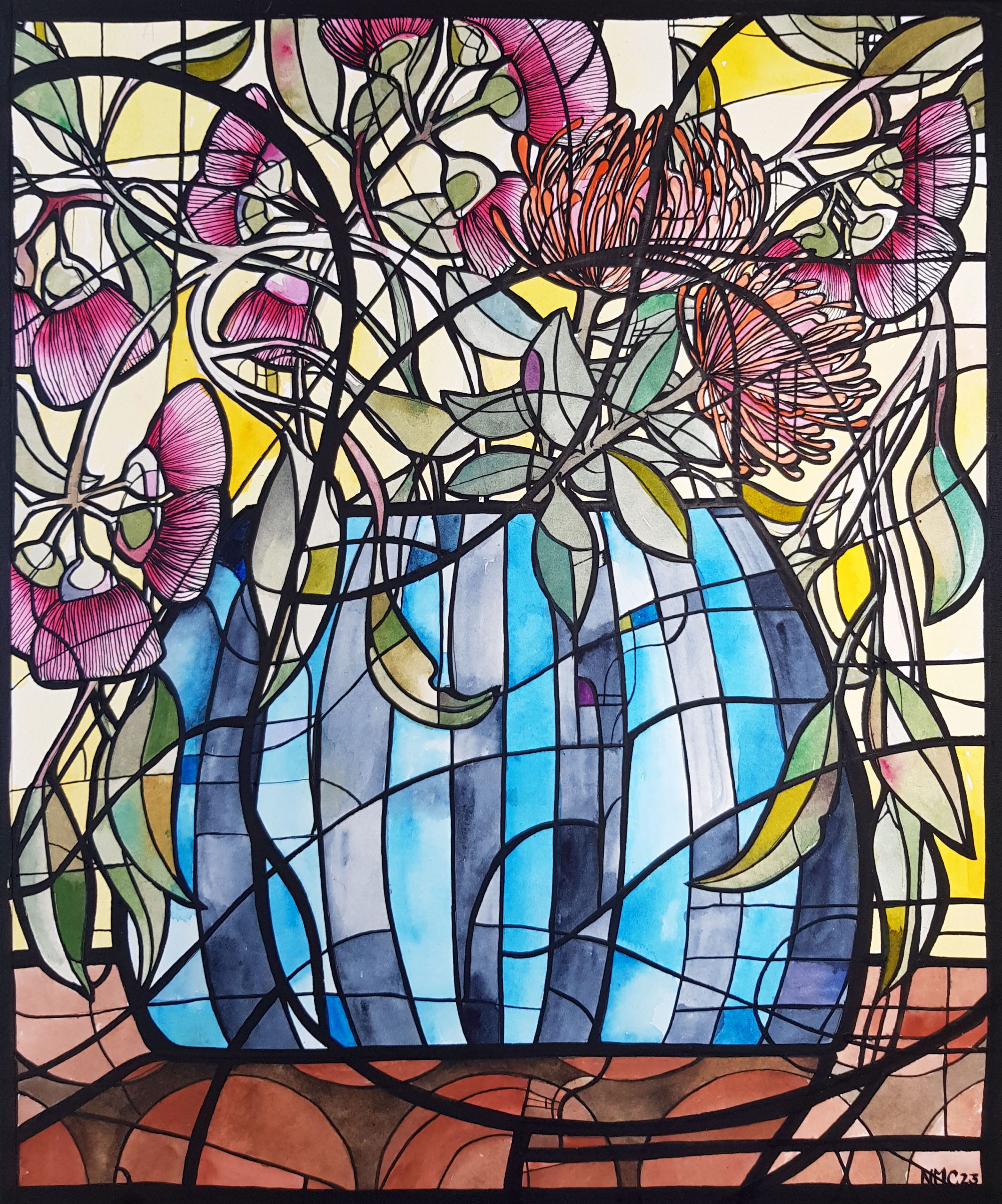 Afternoon Blooms is a watercolour and ink still life. A blue striped vase fills the middle of the painting filled with two pincushion banksias and pink flowering gums which flow up and around the vase.